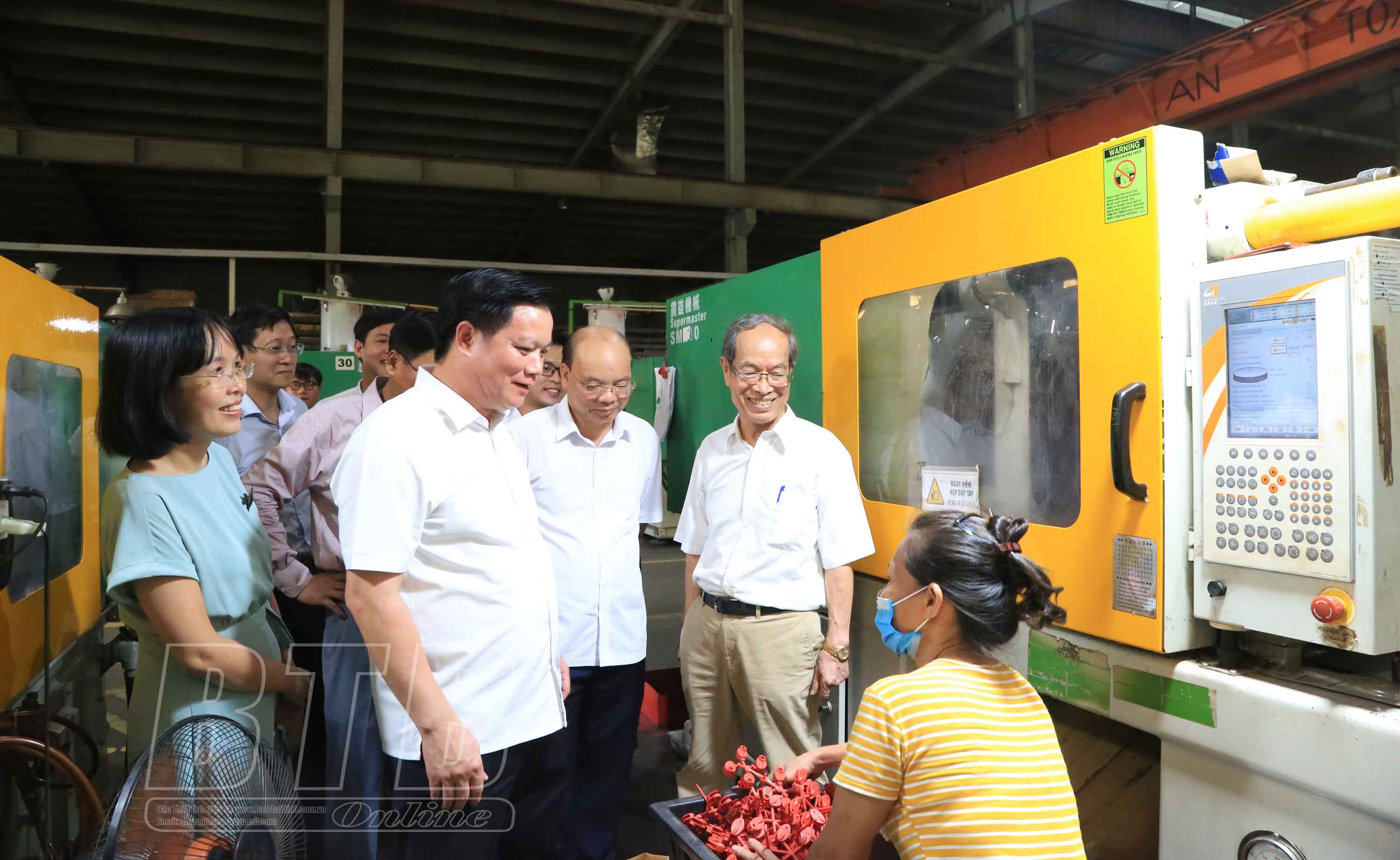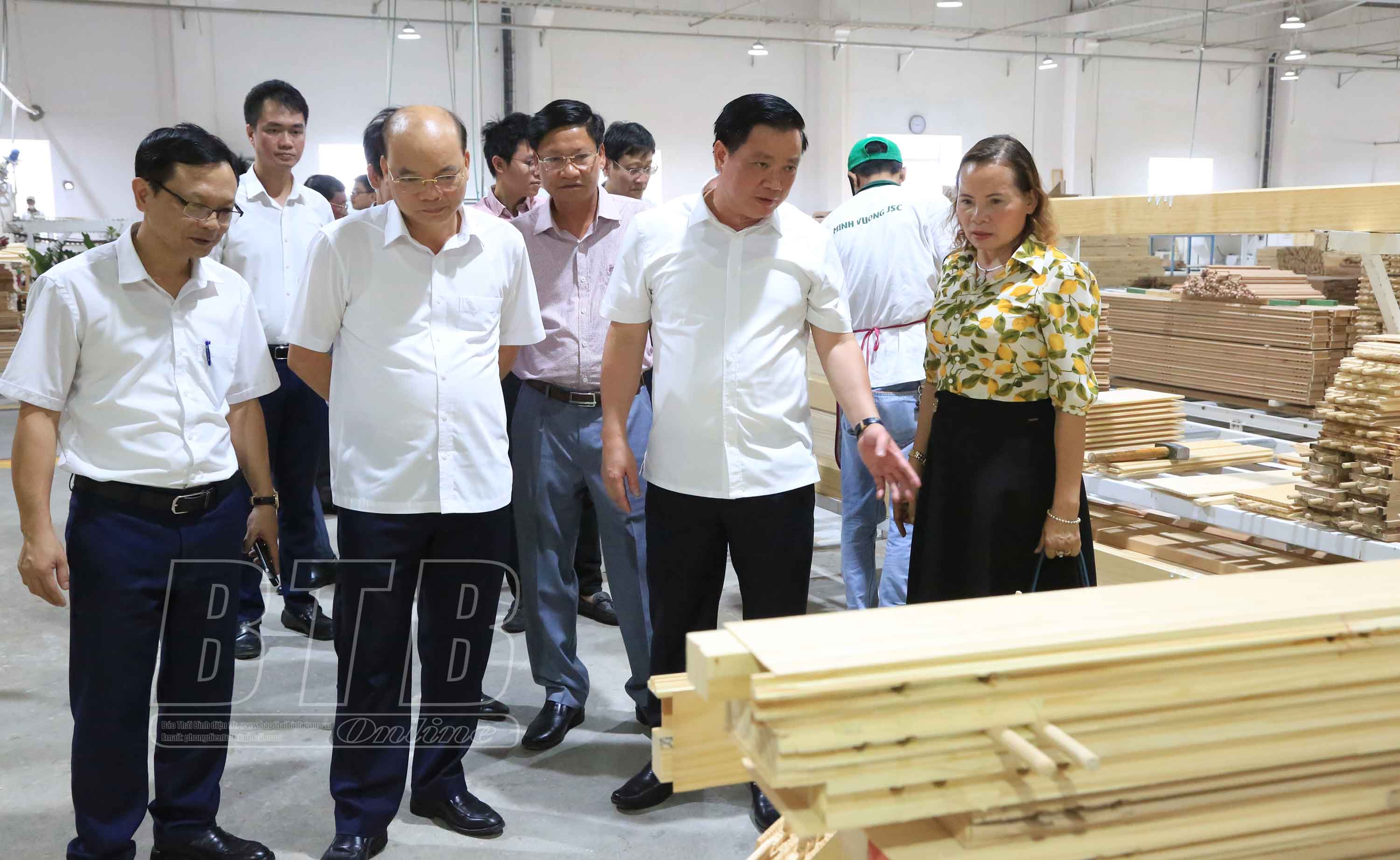 Đoàn đã đến kiểm tra tình sản xuất tại các doanh nghiệp: Công ty Cổ phần Đầu tư thương mại quốc tế Minh Vượng; Công ty Cổ phần Công nghiệp Ngũ Kim Fortress Việt Nam. Hiện nay, Công ty Cổ phần Đầu tư thương mại quốc tế Minh Vượng chuyên sản xuất cửa gỗ xuất khẩu đi các nước châu Âu và Mỹ; doanh thu 8 tháng đầu năm 2022 đạt gần 7 triệu USD; thu hút và tạo việc làm cho 200 lao động với mức thu nhập từ 9 đến 10 triệu đồng/người/tháng. Công ty Cổ phần Công nghiệp Ngũ Kim Fortress Việt Nam chuyên sản xuất thiết bị làm vườn xuất khẩu, hiện tạo việc làm cho 1.200 lao động. Năm 2022, Công ty phấn đấu sản xuất đạt doanh thu trên 32 triệu USD.