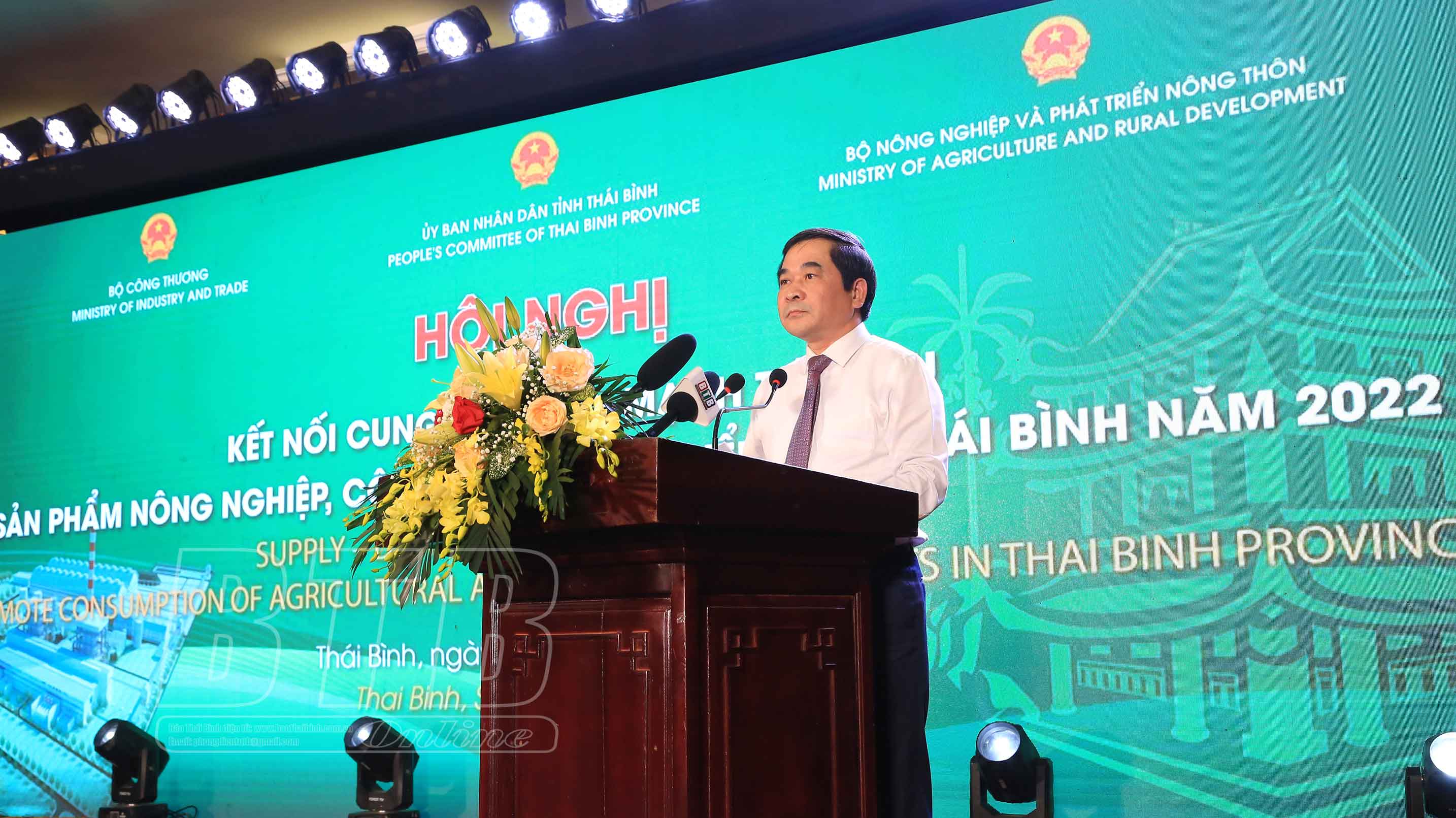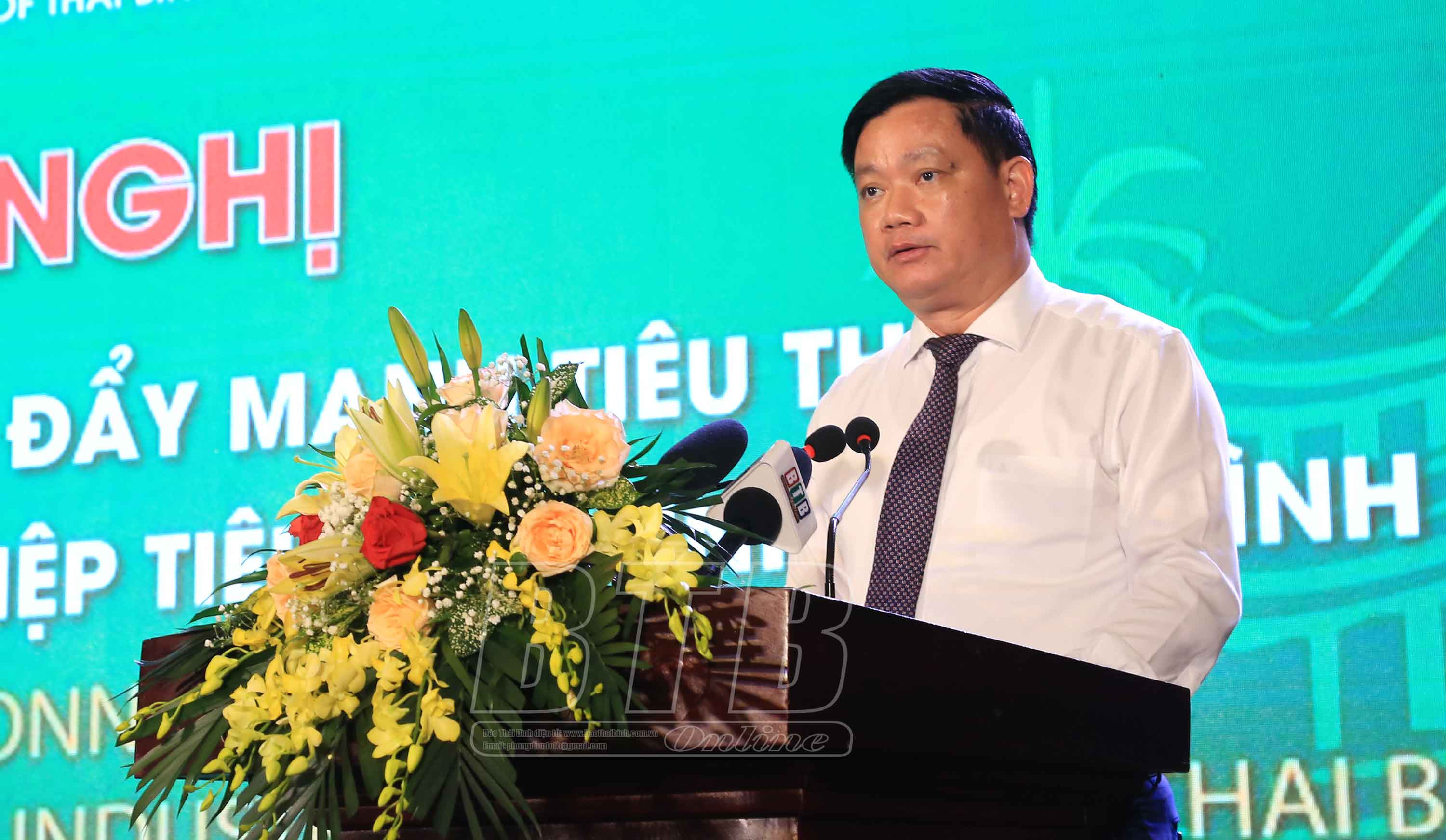 Phát biểu tại hội nghị, đồng chí Nguyễn Khắc Thận, Phó Bí thư Tỉnh ủy, Chủ tịch UBND tỉnh cảm ơn sự phối hợp và giúp đỡ của các bộ, ngành trung ương, các Thương vụ Việt Nam ở nước ngoài, cấp ủy, chính quyền các tỉnh, thành phố và cộng đồng doanh nghiệp đã hỗ trợ Thái Bình xúc tiến thương mại, kết nối cung cầu đẩy mạnh tiêu thụ sản phẩm cho người dân, doanh nghiệp. Đồng chí cho biết, hiện nay tỉnh tập trung phát triển mạnh một số ngành công nghiệp chủ lực, hướng tới trở thành tỉnh công nghiệp theo hướng hiện đại. Đối với các ngành sản xuất nông nghiệp được cơ cấu lại theo hướng sản xuất hàng hóa hiện đại, bền vững; chú trọng đẩy mạnh ứng dụng công nghệ cao, chuyển đổi số vào sản xuất nông nghiệp, công nghiệp và các hoạt động xúc tiến thương mại để nâng cao giá trị gia tăng; kết nối ngày càng chặt chẽ với mạng lưới sản xuất, phân phối giữa các tỉnh, thành phố. Đặc biệt, đối với các nông sản sẽ quan tâm đầu tư xây dựng thương hiệu, nhãn hiệu tập thể, chỉ dẫn địa lý, truy xuất nguồn gốc sản phẩm, đẩy mạnh công tác quảng bá, xúc tiến thương mại với nhiều hình thức.