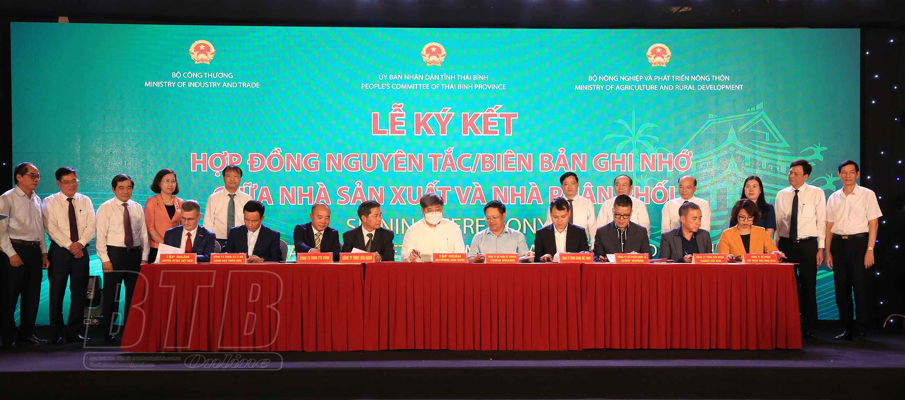 Hội nghị đã chứng kiến lễ khởi động chương trình “Đưa hàng hóa nông nghiệp, công nghiệp tiêu biểu của tỉnh Thái Bình vào hệ thống phân phối”; chứng kiến lễ ký kết biên bản ghi nhớ và hợp đồng mua bán hàng hóa giữa Công ty Cổ phần Tập đoàn Thái Bình Seed với Công ty TNHH MM Mega Market Việt Nam, Công ty Cổ phần Quốc tế Bảo Hưng với Công ty TNHH Genki Việt Nam, Công ty Cổ phần Kỹ thương Thiên Hoàng với Tập đoàn Tae Young Hàn Quốc, Công ty TNHH Sản xuất và Kinh doanh bánh kẹo Thiên Đức với Tập đoàn Central Retail Việt Nam, Công ty TNHH Liên Hạnh với Công ty TNHH TTC Pood; chứng kiến Sở Công Thương ký thỏa thuận đưa các sản phẩm nông nghiệp, công nghiệp tiêu biểu của tỉnh lên 8 sàn thương mại điện tử lớn nhất Việt Nam hiện nay gồm Postmart, Sendo, Tiki, Shopee, Voso, Alibaba, Lazada và Mekong delta.