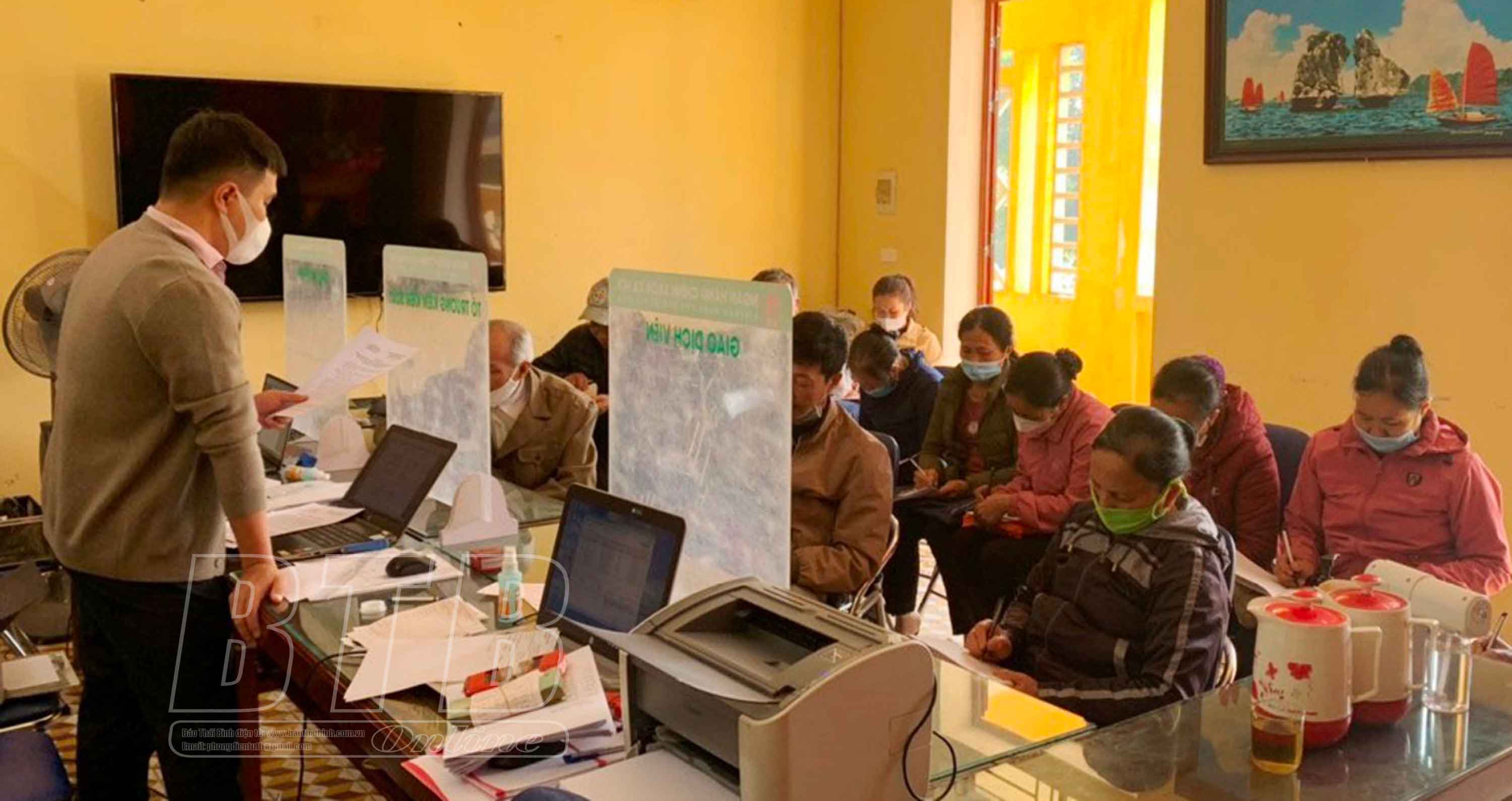 Cán bộ Ngân hàng CSXH huyện Hưng Hà phổ biến việc giảm lãi suất cho vay các chương trình tín dụng tại xã Kim Trung.