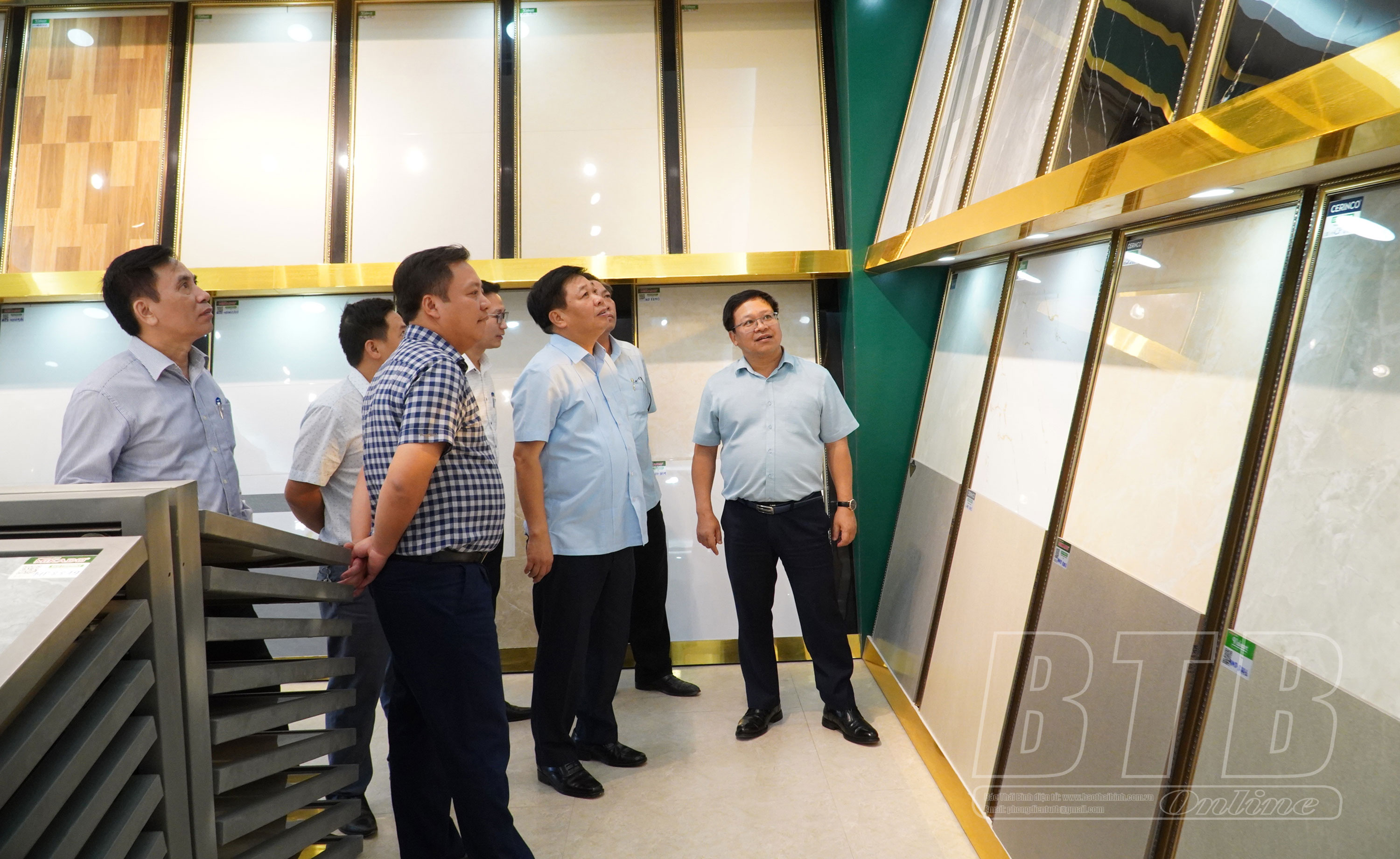 Đồng chí Nguyễn Quang Hưng, Ủy viên Ban Thường vụ Tỉnh ủy, Phó Chủ tịch thường trực UBND tỉnh đi thăm dây chuyền sản xuất gạch ốp lát của Công ty Cổ phần Kỹ thương Thiên Hoàng.