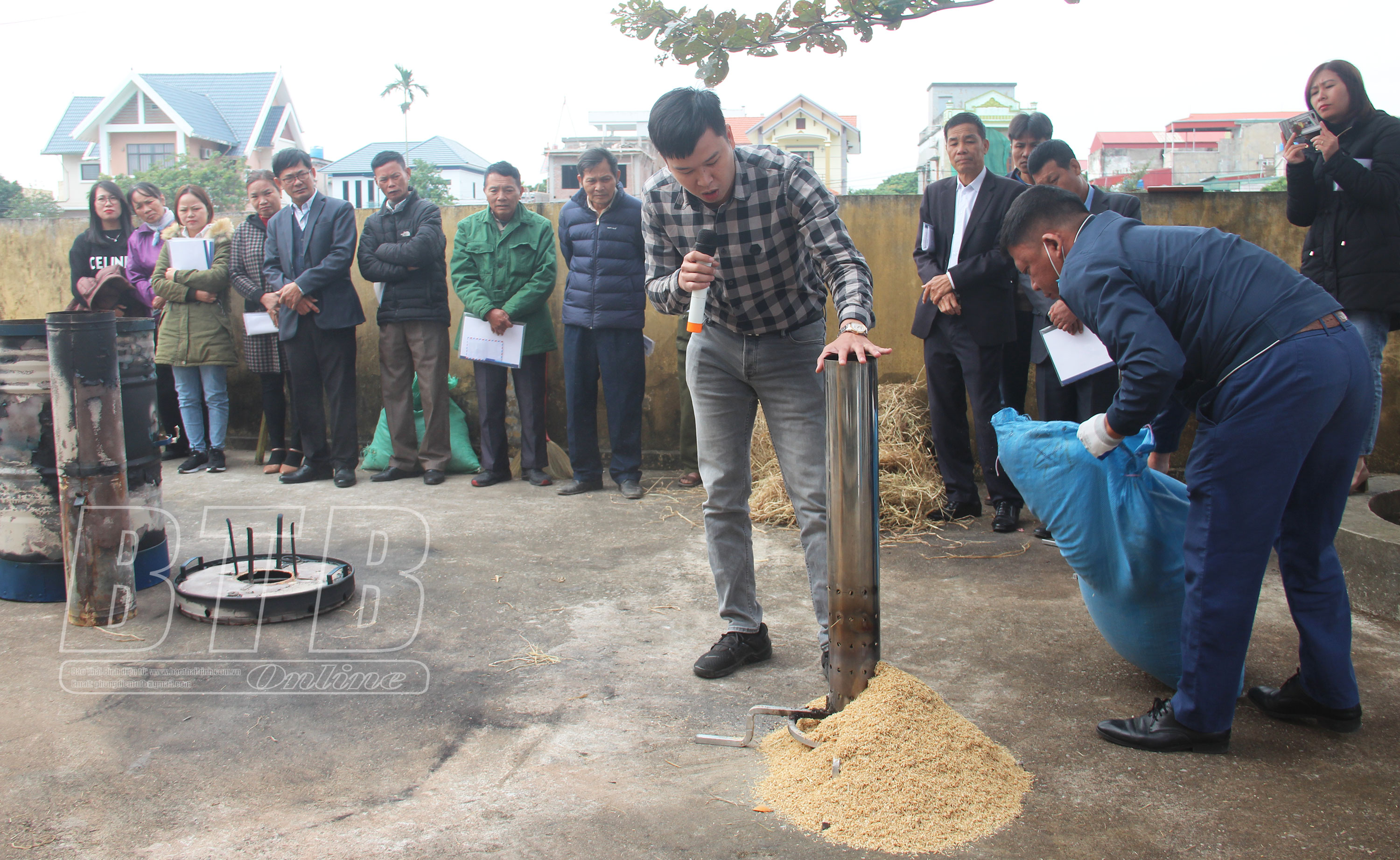 Cán bộ Viện Môi trường nông nghiệp giới thiệu, hướng dẫn kỹ thuật sản xuất than sinh học bằng ống khói.