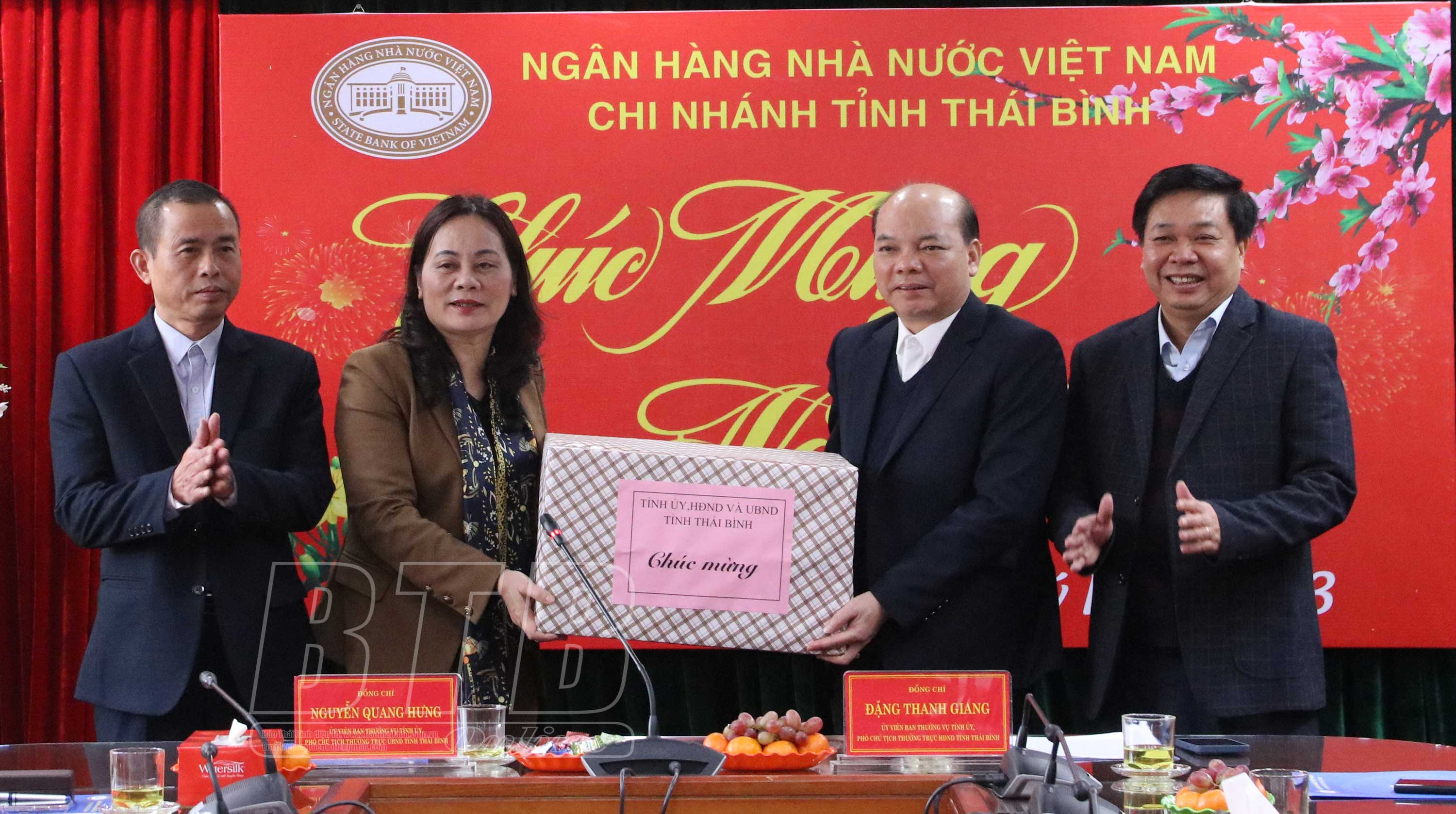 Các đồng chí lãnh đạo tỉnh tặng quà cán bộ, nhân viên Ngân hàng Nhà nước Việt Nam chi nhánh Thái Bình.