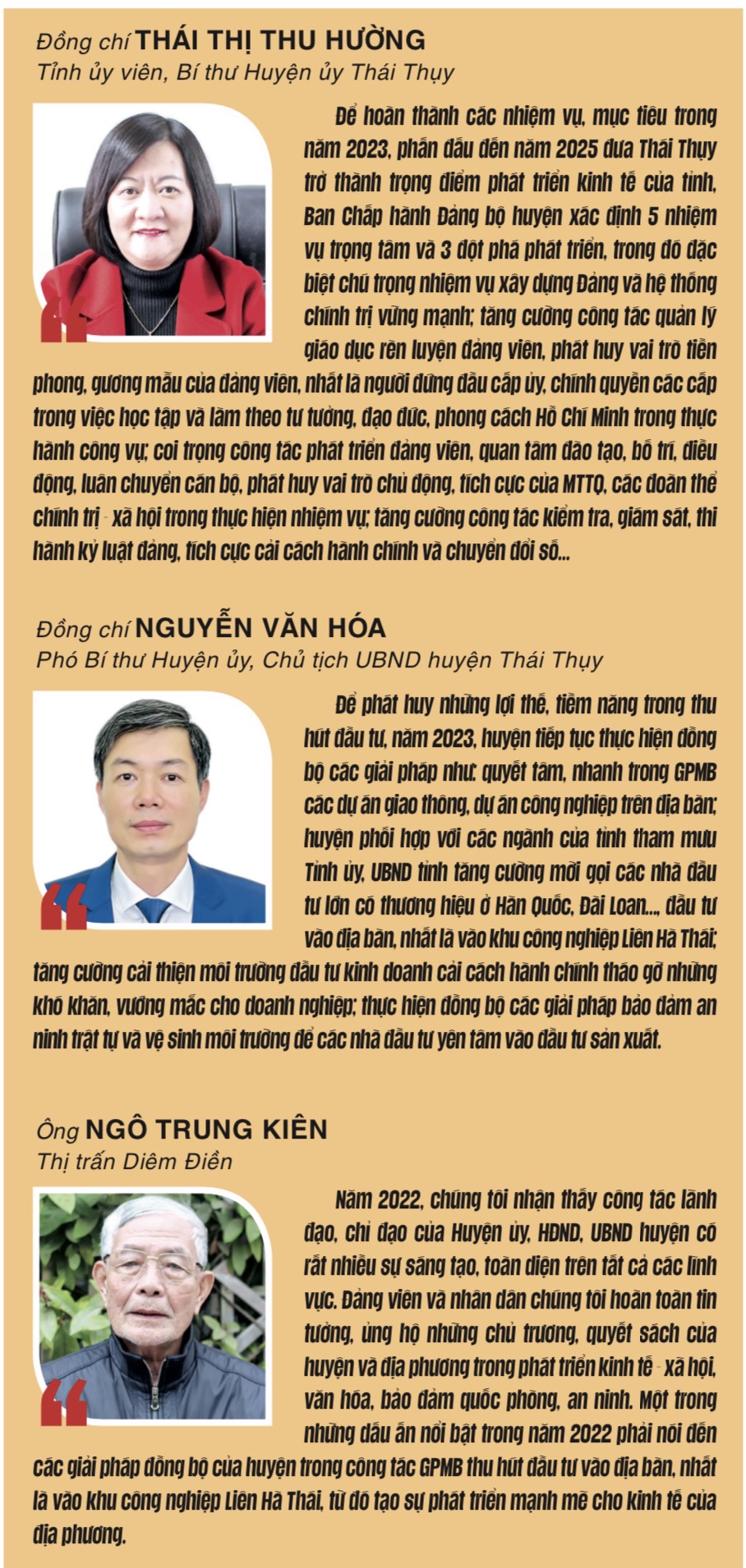 Kết thúc năm 2022, nhìn vào những con số thống kê, Thái Thụy đã đạt được nhiều chỉ tiêu quan trọng. Tổng giá trị sản xuất đạt hơn 29.436 tỷ đồng, tăng 8,3% so với năm 2021. Kinh tế của huyện có sự phục hồi nhanh trên các lĩnh vực, với tốc độ tăng trưởng đạt khá, hầu hết các ngành sản xuất, kinh doanh trở lại trạng thái bình thường sau dịch Covid-19; sản xuất nông nghiệp duy trì ổn định; thu ngân sách nhà nước đạt kết quả khá; tỷ lệ giải ngân vốn đầu tư công đạt kết quả cao. Lĩnh vực văn hóa, xã hội có nhiều tiến bộ; việc thực hiện chế độ, chính sách đối với người và gia đình có công, đối tượng bảo trợ xã hội được bảo đảm đúng quy định. Các hoạt động văn hóa, thể thao, du lịch, thông tin, tuyên truyền được đẩy mạnh. Công tác tiếp dân, giải quyết đơn thư khiếu nại, tố cáo của công dân được chấn chỉnh. Công tác phòng, chống tham nhũng, lãng phí; bảo đảm an ninh chính trị, trật tự an toàn xã hội; tăng cường tiềm lực quân sự, quốc phòng địa phương được củng cố và nâng cao. Công tác xây dựng Đảng, hệ thống chính trị được chỉ đạo, thực hiện đồng bộ, hiệu quả.