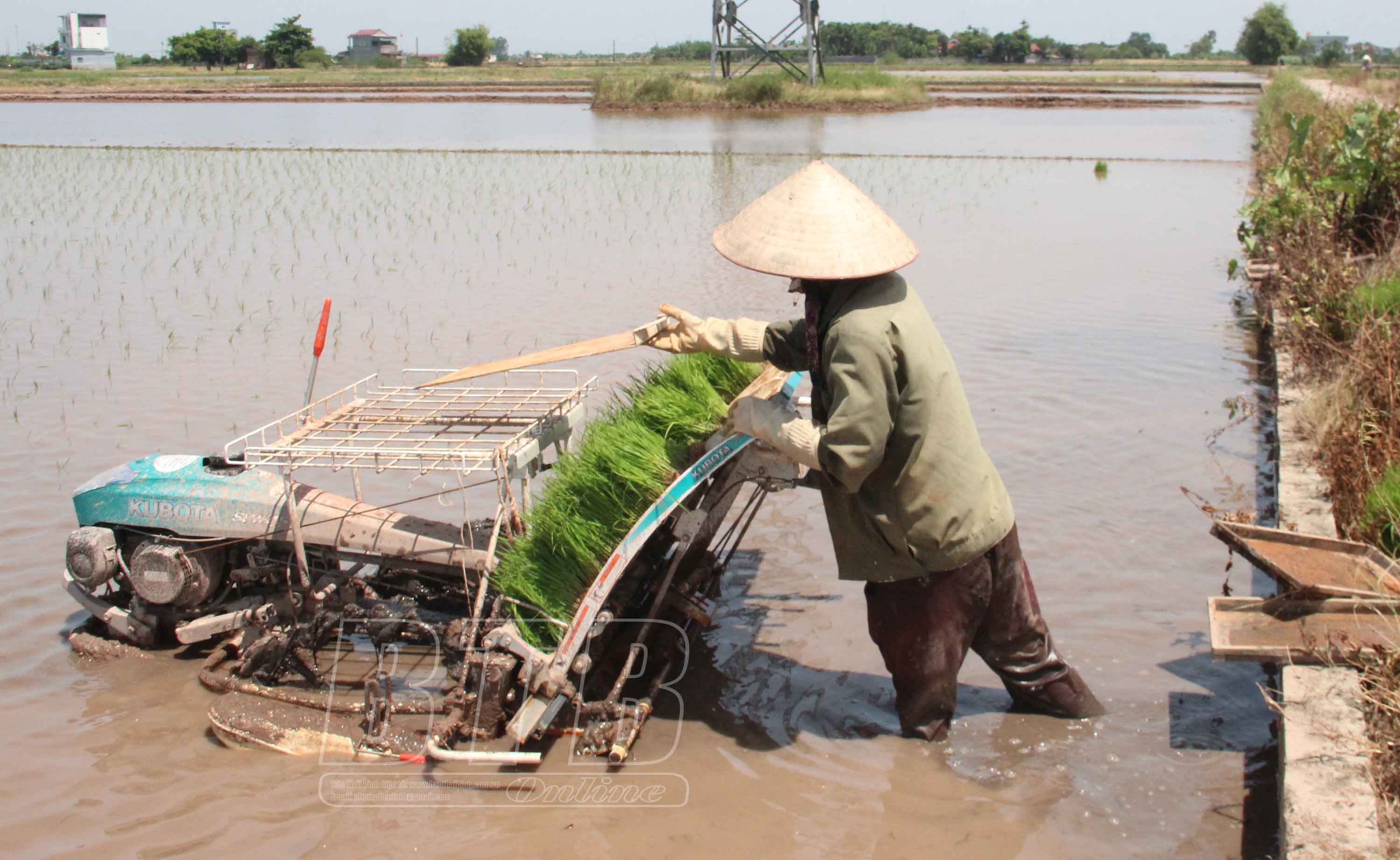 Nông dân huyện Kiến Xương sử dụng máy cấy dắt tay để đẩy nhanh tiến độ gieo cấy.