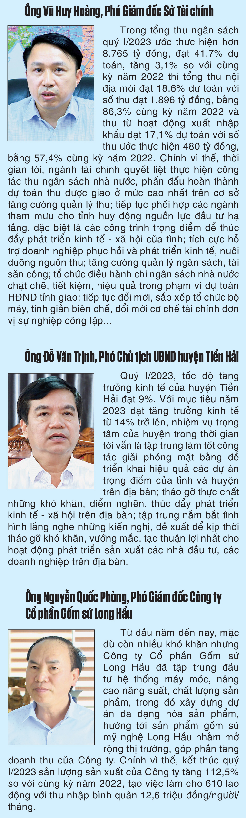 Trong tổng sản phẩm (GRDP) trên địa bàn tỉnh quý I/2023 ước đạt 14.696 tỷ đồng thì khu vực nông nghiệp, lâm nghiệp và thủy sản tăng 2,13%; khu vực công nghiệp và xây dựng tăng 14,04% (trong đó công nghiệp tăng 16,17%, xây dựng tăng 9,4%); khu vực dịch vụ tăng 6,41% so với cùng kỳ năm 2022. Tăng trưởng khá nhất phải kể đến lĩnh vực công nghiệp với giá trị sản xuất ước đạt 21.036 tỷ đồng, đạt 18,5% kế hoạch, trong đó công nghiệp chế biến, chế tạo là động lực tăng trưởng ước đạt 19.001 tỷ đồng, tăng 6,6%, sản xuất truyền tải và phân phối điện ước đạt 1.892 tỷ đồng, tăng 57,7% so với cùng kỳ năm 2022.