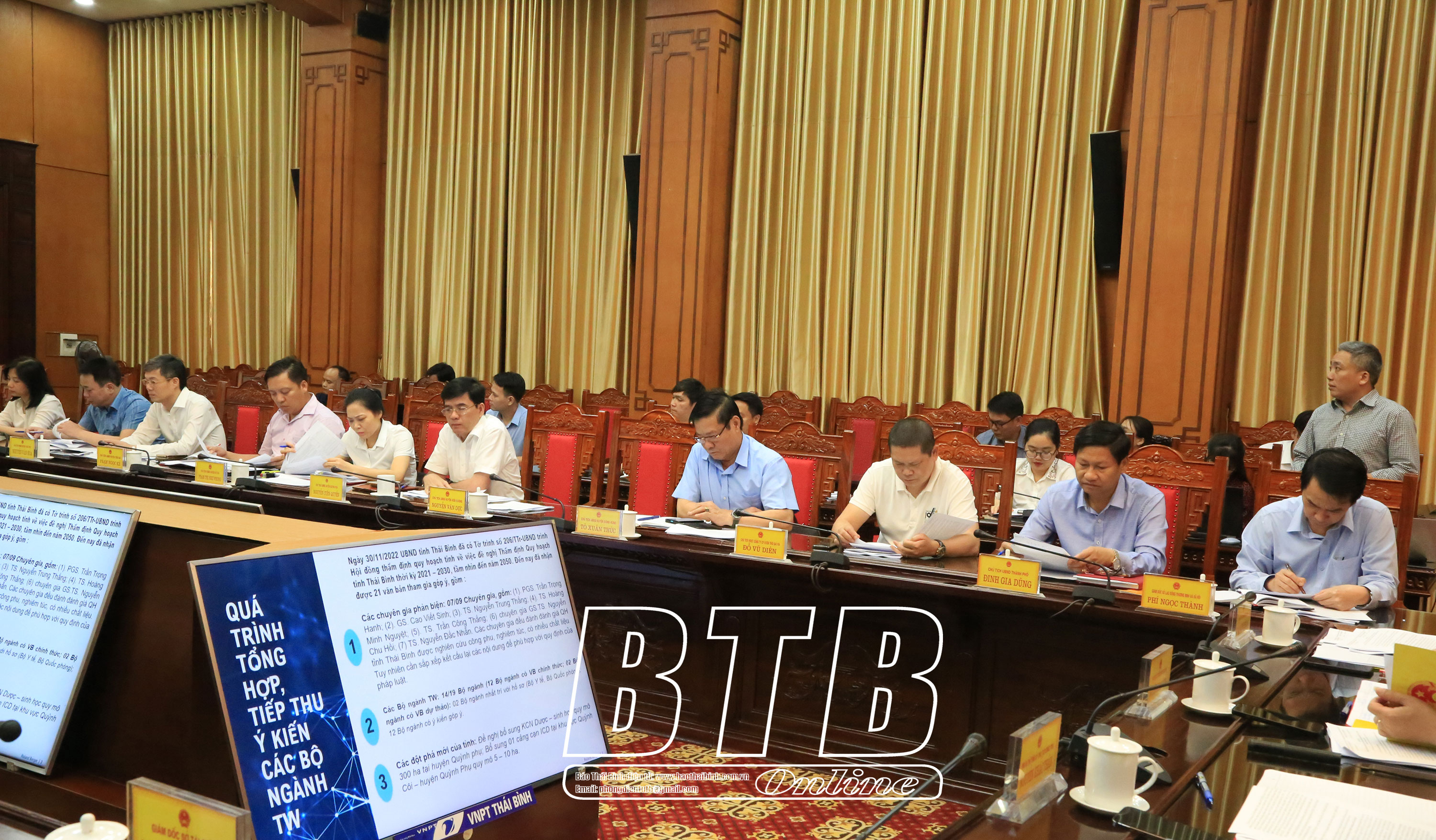Theo báo cáo của đơn vị tư vấn, đến nay, hồ sơ thẩm định đã bảo đảm hoàn thành theo quy định tại Điều 31, Luật Quy hoạch. Từ khi triển khai thực hiện đến nay, UBND tỉnh và Ban Chỉ đạo lập QHT đã tổ chức trên 20 cuộc họp, hội nghị làm việc về QHT. Đến thời điểm hiện tại đã nhận được ý kiến tham gia của 19 bộ và cơ quan ngang bộ; 10 chuyên gia và 10 UBND tỉnh trong vùng đồng bằng sông Hồng và các cơ quan, đơn vị trong tỉnh. Hiện nay, đơn vị tư vấn đang tiếp thu, cập nhật một số định hướng phát triển lớn vào QHT như: Khu công nghiệp Dược - Sinh học tại huyện Quỳnh Phụ, cảng cạn ICD Quỳnh Côi (Quỳnh Phụ); điều chỉnh, bổ sung chỉ tiêu sử dụng đất trong một số lĩnh vực. Theo kế hoạch, dự kiến tháng 5/2023, tỉnh sẽ hoàn thiện hồ sơ, tài liệu QHT để báo cáo Hội đồng thẩm định quốc gia về QHT và sau đó sẽ tiếp tục tiếp thu, hoàn thiện dự thảo trình Thủ tướng Chính phủ trong thời gian tới.