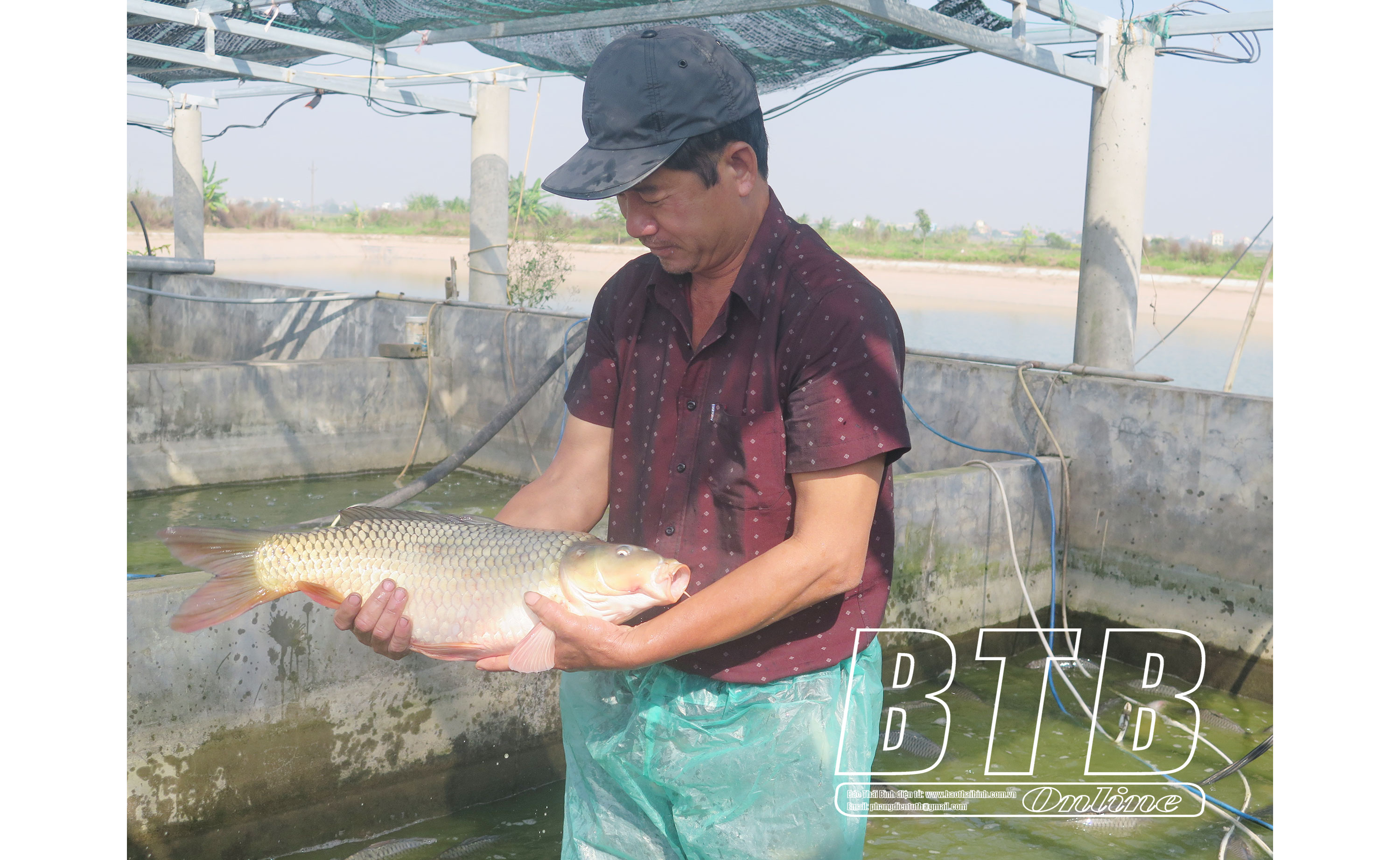 Mô hình nuôi cá trong ao bán nổi của ông Nguyễn Văn Phương, thôn Mộ Đạo 3, xã Vũ Bình.