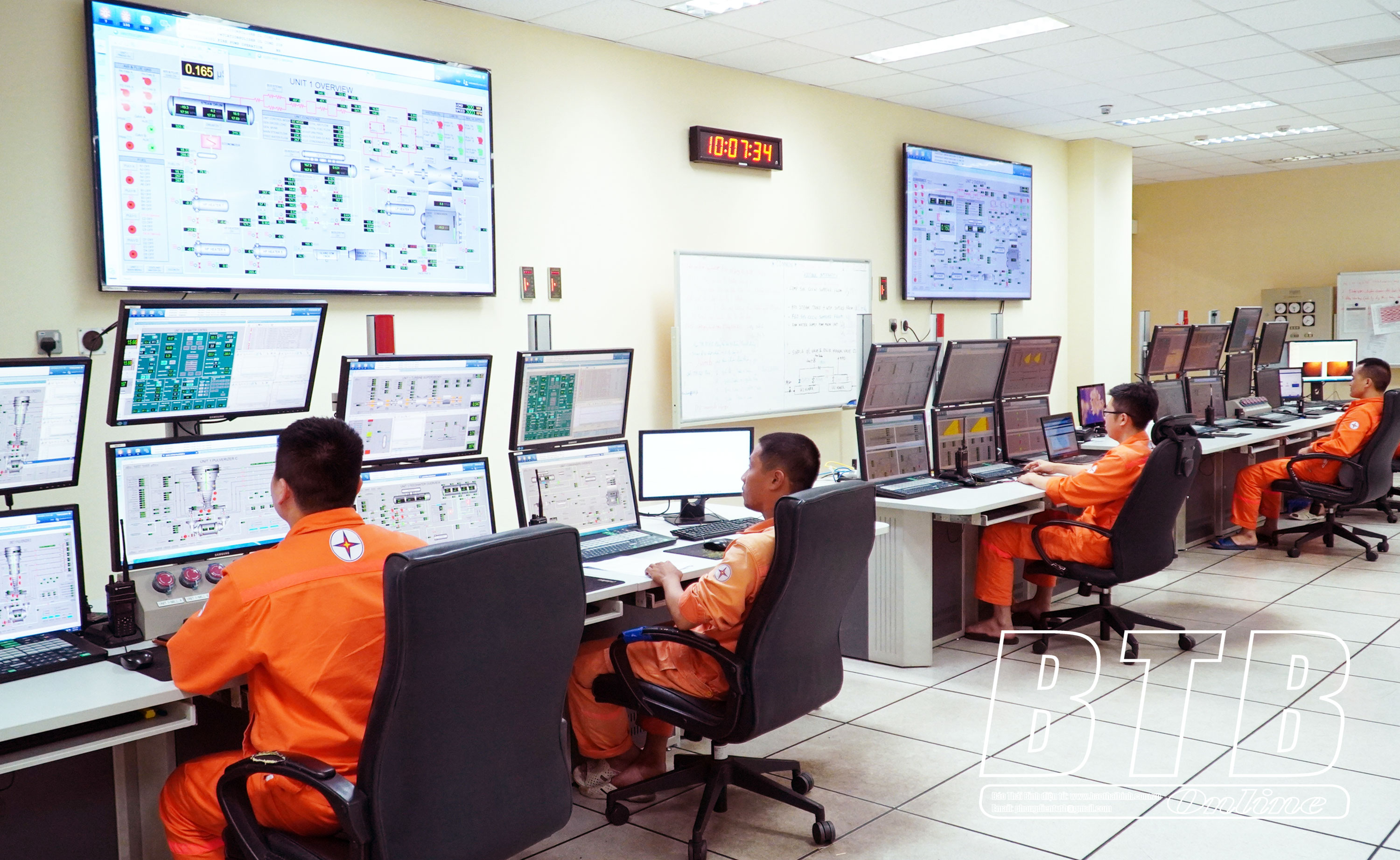 Từ đầu mùa khô đến nay, 2 tổ máy của Nhà máy Nhiệt điện Thái Bình luôn chạy hết công suất, phát điện liên tục 24/24 giờ, Công ty phải phân công lực lượng trực làm việc 3 ca, 5 kíp. Trong ảnh: Các kỹ sư trực vận hành 2 tổ máy phát điện tại phòng điều khiển trung tâm.