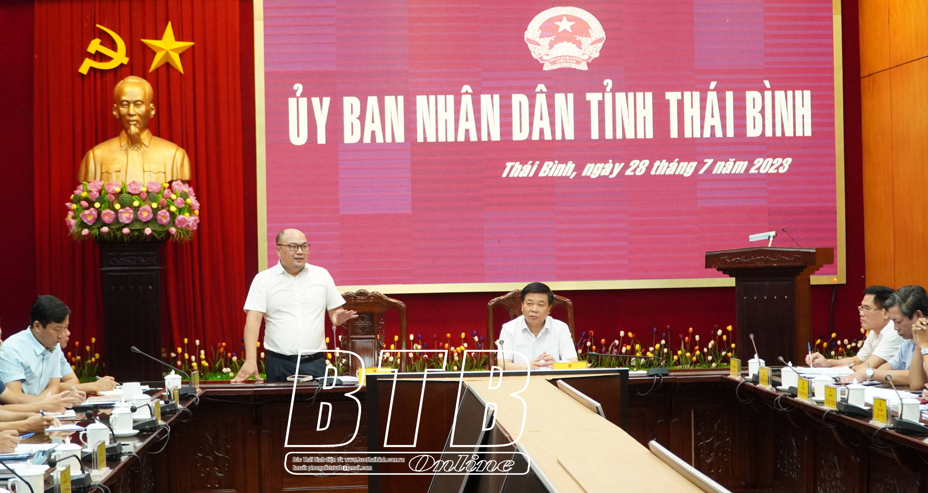 Sáng ngày 28/7, UBND tỉnh tổ chức cuộc họp nghe Sở Công Thương và Cục Hóa chất (Bộ Công Thương) báo cáo công tác phối hợp tổ chức diễn tập ứng phó sự cố hóa chất năm 2023 tại tỉnh Thái Bình. Các đồng chí: Nguyễn Quang Hưng, Ủy viên Ban Thường vụ Tỉnh ủy, Phó Chủ tịch thường trực UBND tỉnh, Trưởng ban Chỉ đạo phòng ngừa, ứng phó sự cố hóa chất tỉnh; Phạm Huy Nam Sơn, Phó Cục trưởng Cục Hóa chất, Bộ Công Thương chủ trì cuộc họp.