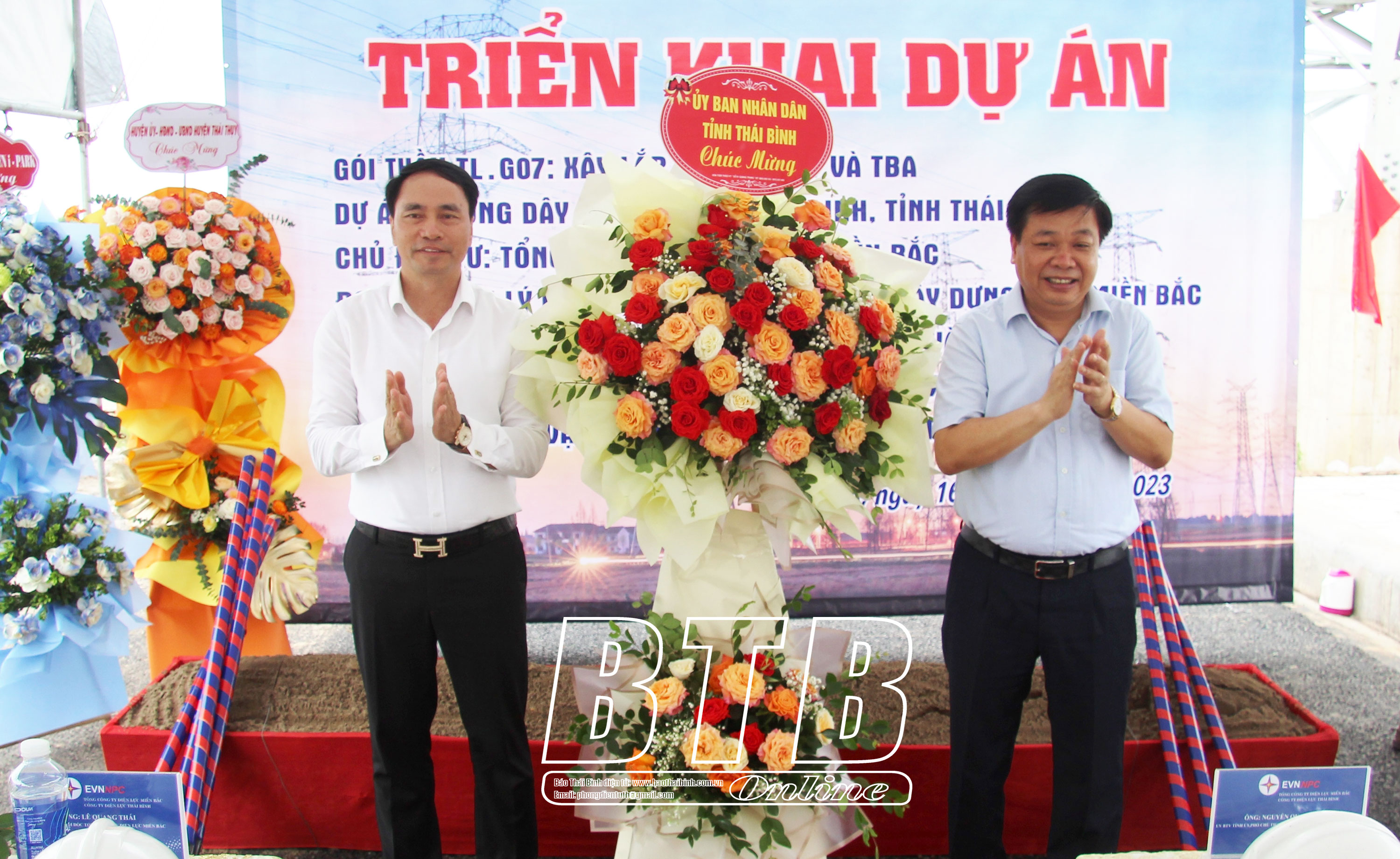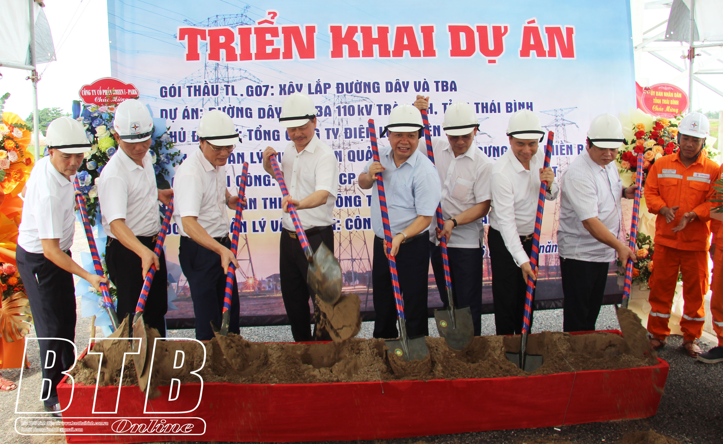 Đồng chí Nguyễn Quang Hưng, Ủy viên Ban Thường vụ Tỉnh ủy, Phó Chủ tịch thường trực UBND tỉnh và các đại biểu thực hiện nghi thức triển khai dự án trạm biến áp 110kV Trà Linh, huyện Thái Thụy.