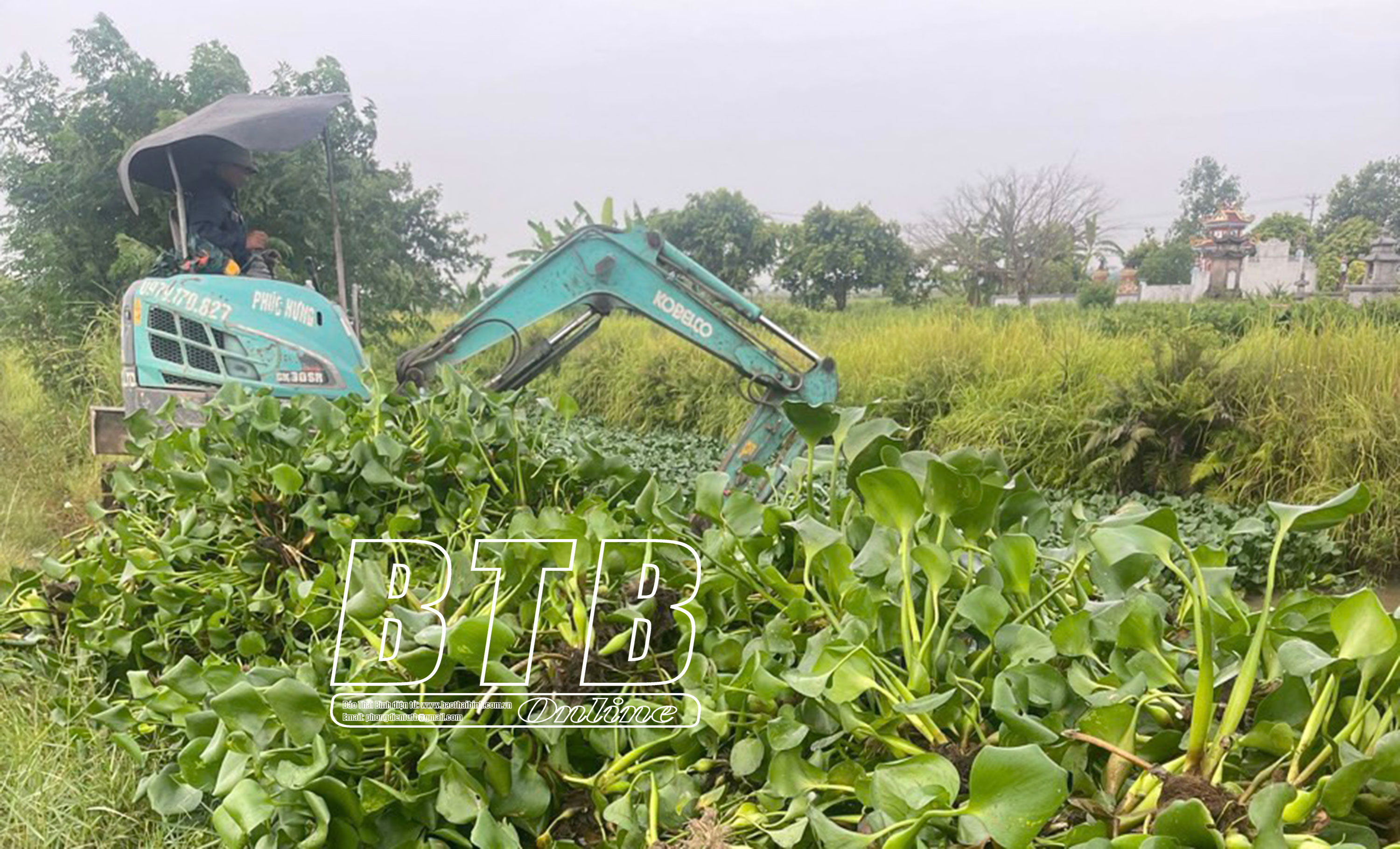 Xí nghiệp Khai thác công trình thủy lợi huyện Thái Thụy huy động máy móc khơi thông dòng chảy trên tuyến mương nội đồng. Ảnh: Trần Tuấn