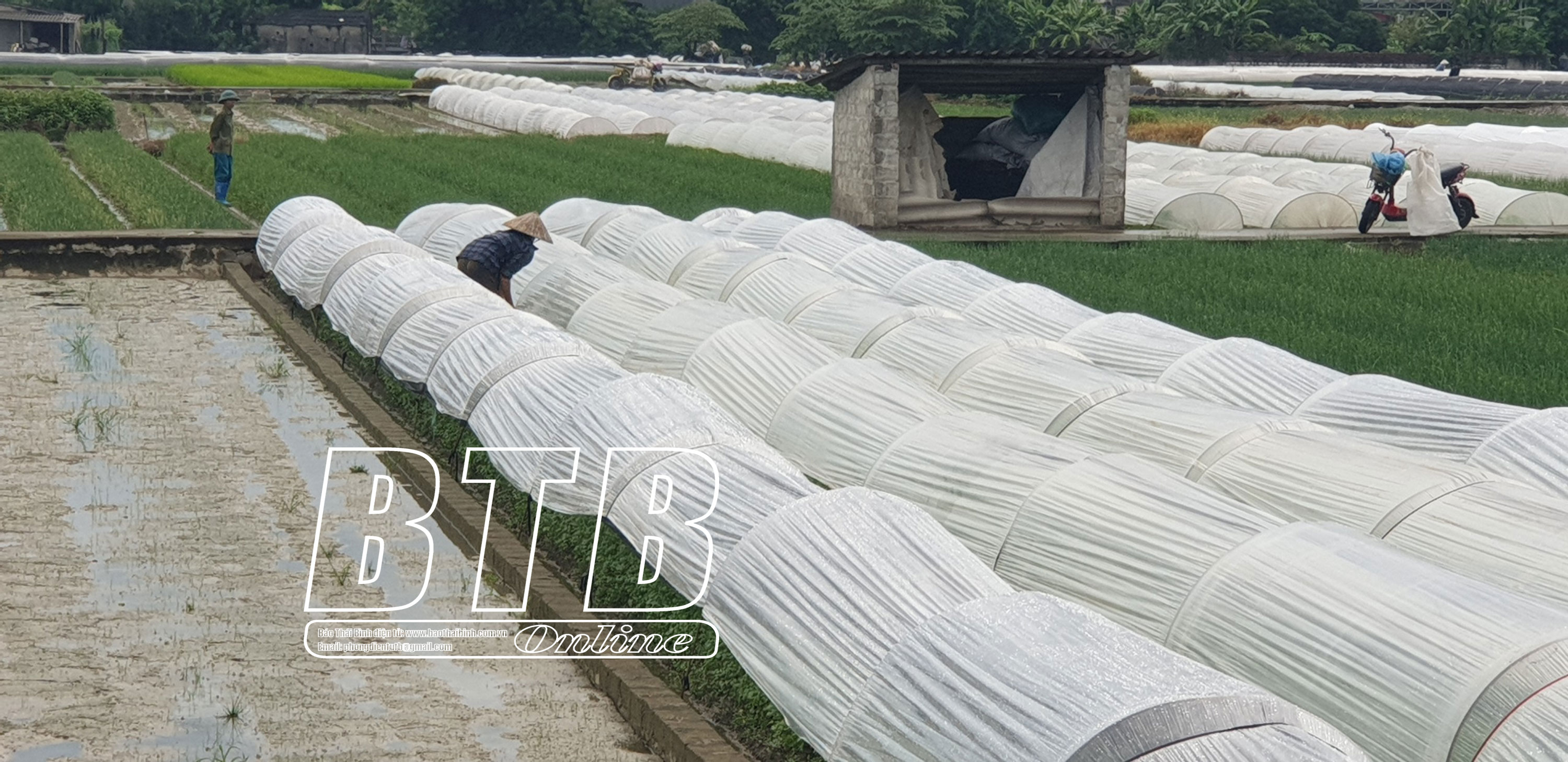 Nông dân xã Quỳnh Hải làm vòm nilon che mưa để hạn chế rau bị dập nát. Ảnh: Nguyễn Cường