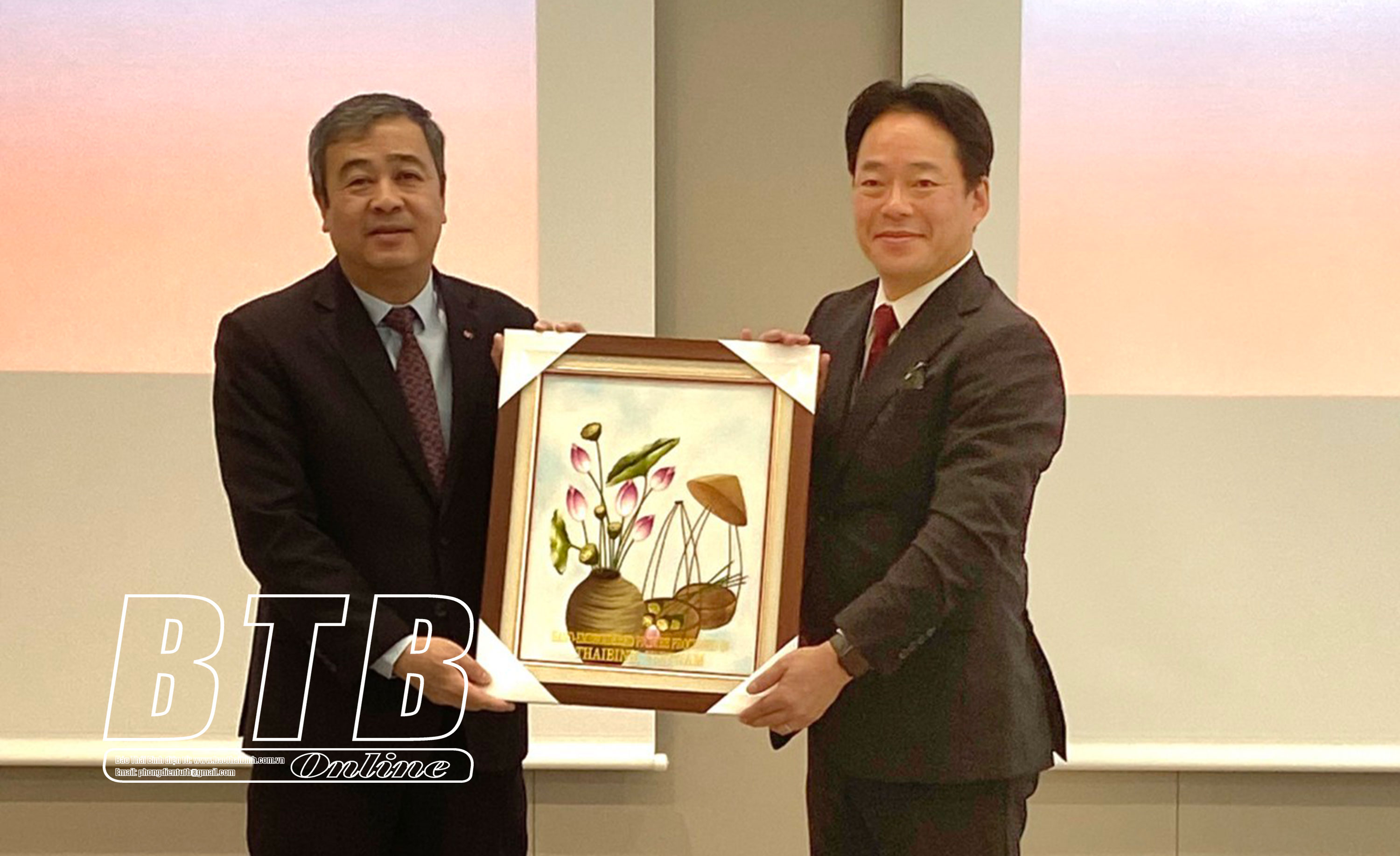 Đồng chí Ngô Đông Hải, Ủy viên Ban Chấp hành Trung ương Đảng, Bí thư Tỉnh ủy trao quà lưu niệm cho lãnh đạo Tập đoàn Marubeni.