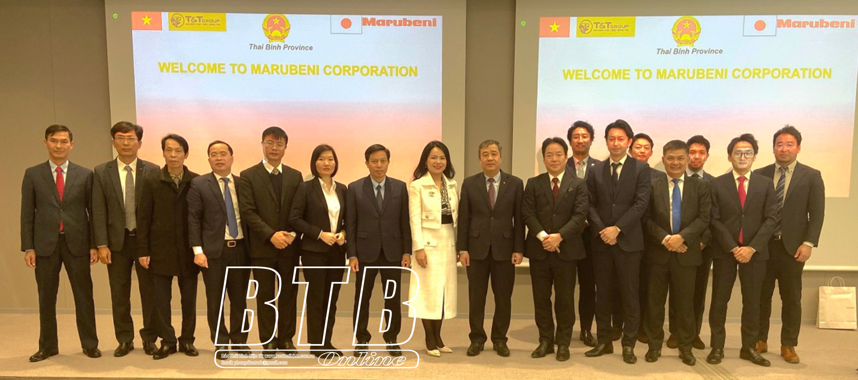 Trong khuôn khổ chuyến công tác tại Nhật Bản, sáng ngày 18/12, các đồng chí: Ngô Đông Hải, Ủy viên Ban Chấp hành Trung ương Đảng, Bí thư Tỉnh ủy; Lại Văn Hoàn, Tỉnh ủy viên, Phó Chủ tịch UBND tỉnh cùng các thành viên trong đoàn công tác của tỉnh đã đến thăm, làm việc với lãnh đạo Tập đoàn Marubeni. Cùng tham gia đoàn công tác có lãnh đạo Tập đoàn T&T Việt Nam.