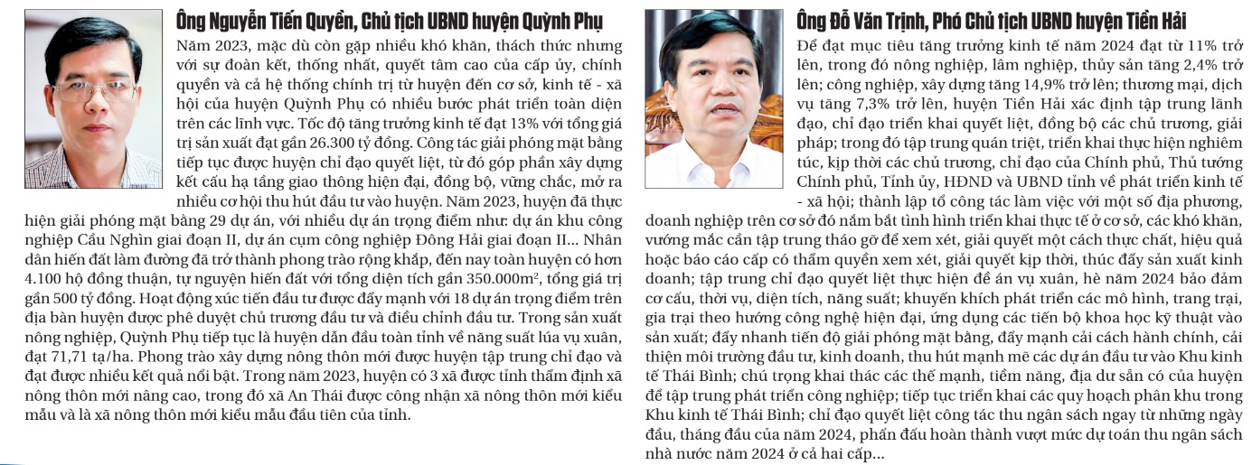 Năm 2024 được dự báo nền kinh tế sẽ tiếp tục đối mặt nhiều khó khăn, thách thức. Nhưng với sự bứt phá của năm 2023 cũng như của giai đoạn 2021 - 2023 và quyết tâm cao của cả hệ thống chính trị, sự đồng thuận, ủng hộ của nhân dân, nỗ lực khắc phục khó khăn vươn lên của cộng đồng doanh nghiệp, tin rằng năm 2024 và những năm tiếp theo Thái Bình sẽ tiếp tục nâng cao vị thế, vươn lên tầm phát triển mới trong khu vực cũng như trên cả nước.
