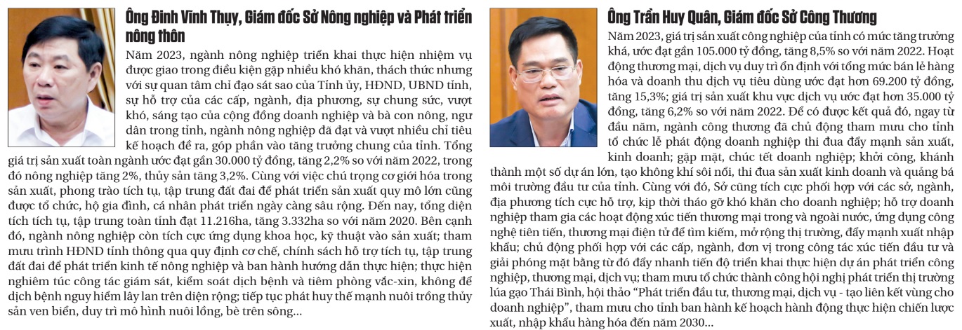 Để có được kết quả đó, ngay từ đầu năm, Tỉnh ủy, HĐND, UBND tỉnh đã dự lường được tình hình và khó khăn phát sinh trong việc thực hiện nhiệm vụ phát triển kinh tế - xã hội năm 2023 nên đã tập trung nguồn lực, quyết liệt trong lãnh đạo, chỉ đạo thực hiện các nhiệm vụ. Các đồng chí Thường trực Tỉnh ủy, HĐND, lãnh đạo UBND tỉnh đã tích cực chỉ đạo, làm việc với trung ương và các nhà đầu tư để tháo gỡ khó khăn, vướng mắc và chuẩn bị các điều kiện cần thiết để triển khai thực hiện một số dự án động lực quan trọng như cao tốc Ninh Bình - Hải Phòng (CT.08), tuyến đường bộ ven biển, dự án nhà máy nhiệt điện LNG Thái Bình, các thủ tục thành lập khu công nghiệp VSIP, khu công nghiệp Dược - Sinh học, khu công nghiệp Tân Trường, khu công nghiệp Hải Long, quy hoạch tỉnh, chỉ tiêu đất công nghiệp... Cùng với đó, tỉnh tổ chức thành công nhiều sự kiện, diễn đàn nhằm mở rộng quan hệ đối ngoại và hợp tác kinh tế quốc tế, thu hút đầu tư, đặc biệt đã tổ chức thành công chương trình giao lưu văn hóa - kết nối doanh nghiệp Việt Nam - Hàn Quốc “Thai Binh Homecoming Day”, từ đó góp phần quảng bá hình ảnh mảnh đất, con người Thái Bình đồng thời mở ra cơ hội thu hút đầu tư, phát triển kinh tế - xã hội. Ngoài ra, UBND tỉnh tập trung rà soát, xử lý kịp thời những khó khăn, vướng mắc, giải quyết các “điểm nghẽn” để khơi thông nguồn lực, khai thác các dư địa và thúc đẩy phát triển các ngành, lĩnh vực. Tỉnh đã thành lập tổ công tác đặc biệt tháo gỡ khó khăn, vướng mắc, hỗ trợ hiệu quả các doanh nghiệp, nhà đầu tư, dự án đầu tư trên địa bàn tỉnh do đồng chí Chủ tịch UBND tỉnh làm tổ trưởng; 3 tổ công tác chỉ đạo giải quyết các công việc còn tồn tại, vướng mắc do các đồng chí Phó Chủ tịch UBND tỉnh làm tổ trưởng; tổ công tác hỗ trợ triển khai dự án điện khí LNG; đồng thời, tổ chức đoàn công tác của tỉnh làm việc với 5 huyện về tình hình phát triển kinh tế - xã hội, giải ngân vốn đầu tư công và tháo gỡ khó khăn, vướng mắc trong sản xuất, kinh doanh.