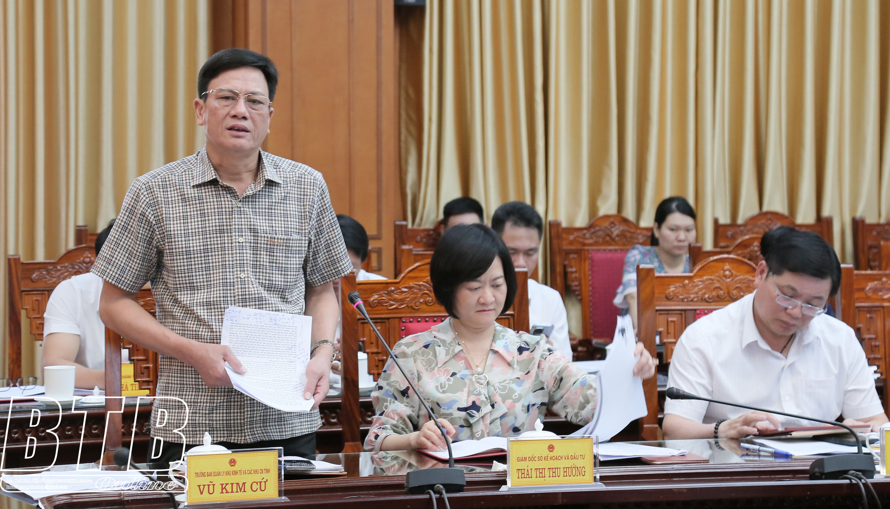 Đồng chí Vũ Kim Cứ, Ủy viên Ban Thường vụ Tỉnh ủy, Trưởng ban Quản lý Khu kinh tế và các khu công nghiệp tỉnh phát biểu tại cuộc họp.