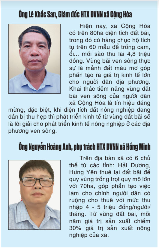 | Hiện nay, giá trị sản xuất của các mô hình ở vùng đất bãi cao gấp 3 - 4 lần cấy lúa, chiếm 25% giá trị sản xuất nông nghiệp toàn huyện, tạo việc làm cho hàng trăm lao động địa phương. |