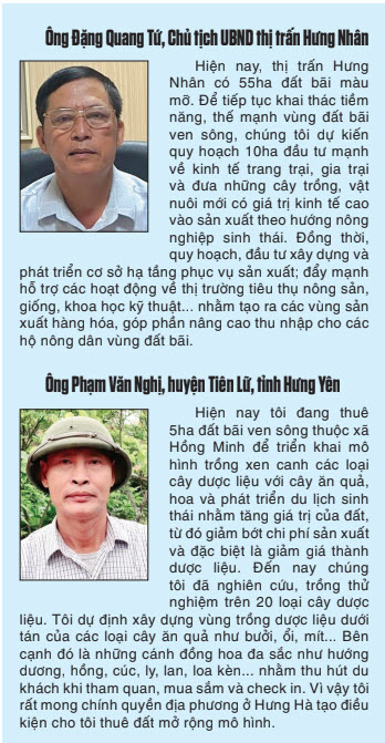Với lợi thế đất đai màu mỡ, các địa phương đã có nhiều cách làm hiệu quả, khai thác được tiềm năng của đất để quy hoạch phát triển sản xuất theo hướng hàng hóa. Hưng Hà phấn đấu thu nhập bình quân đầu người vùng nông thôn đất bãi đạt 70 triệu đồng/ năm vào năm 2025; thu nhập trên 1ha canh tác đạt 300 - 400 triệu đồng/năm, đưa nông nghiệp công nghệ cao, nông nghiệp sạch, sinh thái, hữu cơ vào sản xuất hình thành liên kết theo chuỗi giá trị; xây dựng vùng sản xuất chuyên canh tập trung như sản xuất trong nhà lưới, nhà kính, công nghệ tưới nhỏ giọt tự động...