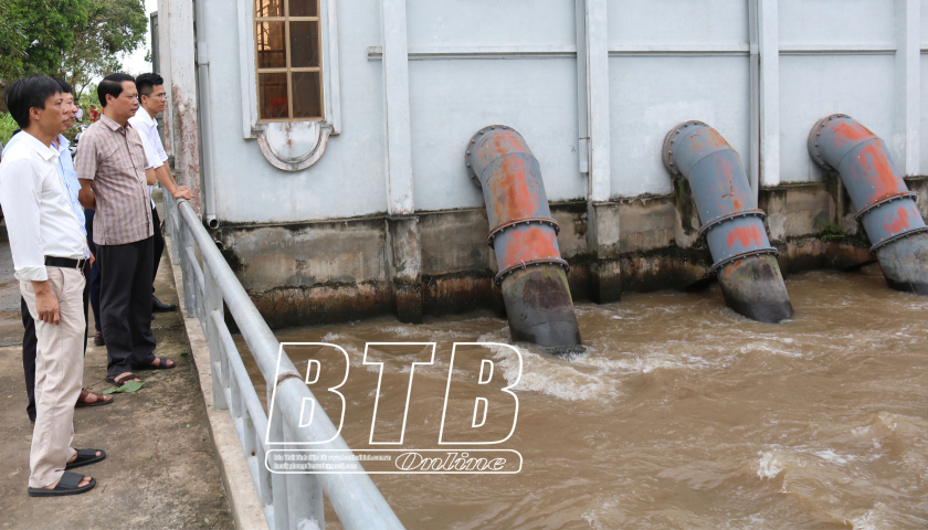 Đồng chí Hoàng Thái Phúc, Ủy viên Ban Thường vụ, Trưởng ban Nội chính Tỉnh ủy kiểm tra, chỉ đạo công tác tiêu thoát nước tại Trạm bơm Quỳnh Hoa.