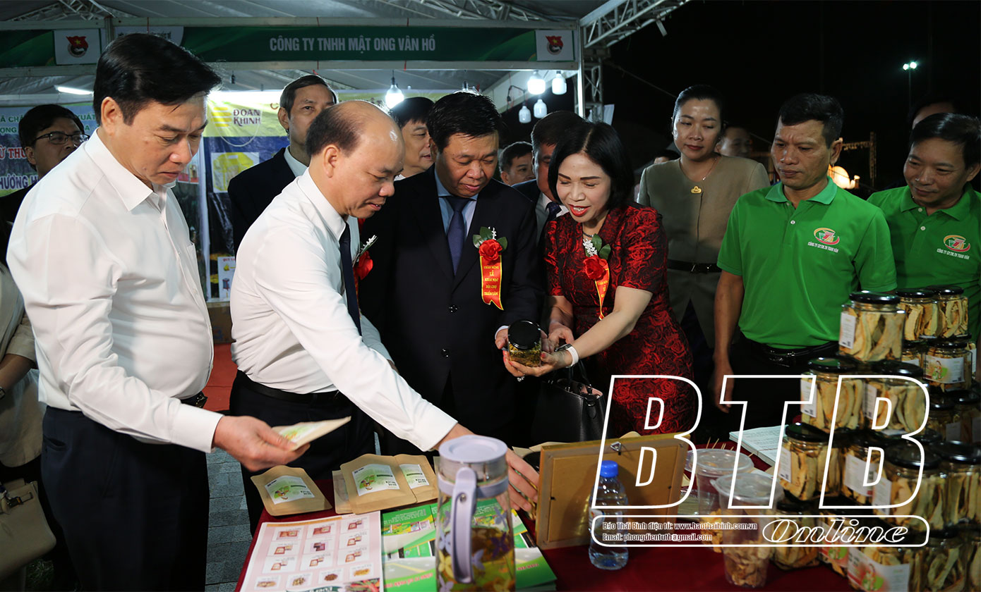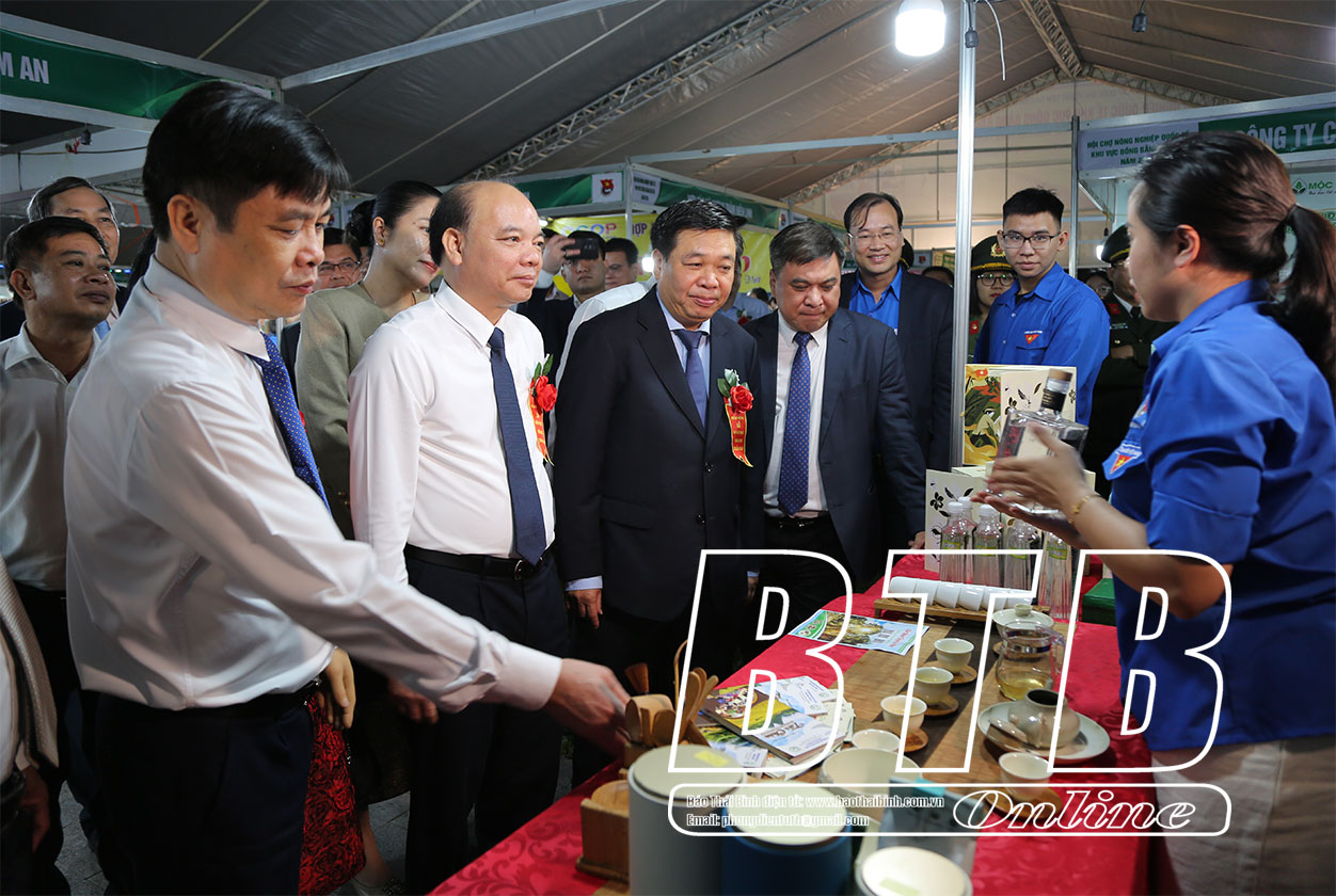 Các đồng chí lãnh đạo tỉnh thăm gian hàng tại hội chợ. Tiết mục văn nghệ chào mừng lễ khai mạc hội chợ