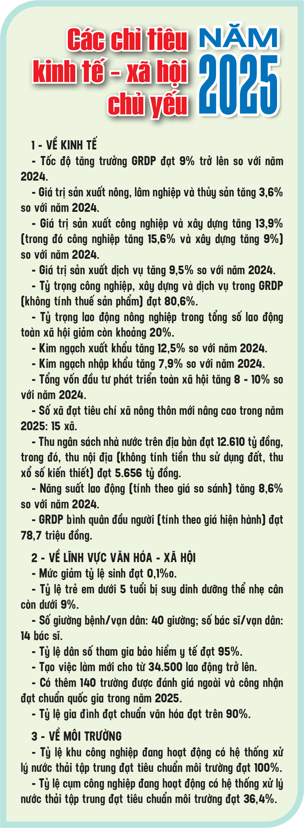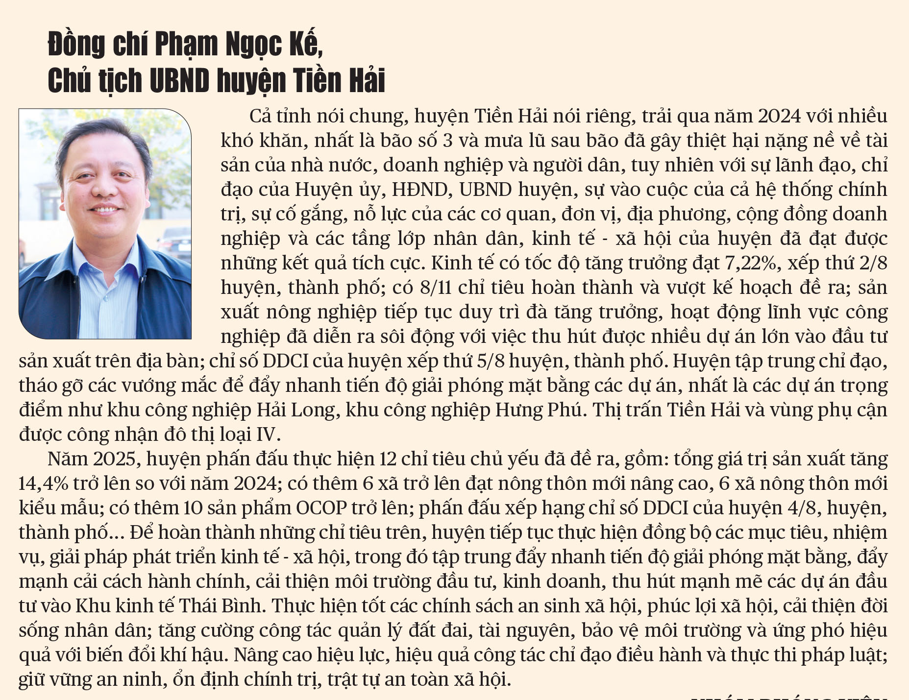 Năm 2025 được dự báo là năm nền kinh tế sẽ tiếp tục đối mặt nhiều khó khăn, thách thức đồng thời là năm có ý nghĩa đặc biệt quan trọng với nhiều sự kiện trọng đại của đất nước. Nhưng với những kết quả đạt được của năm 2024 và sự quyết tâm cao độ của cả hệ thống chính trị chính là cơ sở, tiền đề quan trọng để Thái Bình bước vào giai đoạn bứt phá, tăng tốc, hướng tới những mục tiêu cao hơn trong năm 2025, sẵn sàng cùng cả nước bước vào kỷ nguyên mới, kỷ nguyên vươn mình của dân tộc.