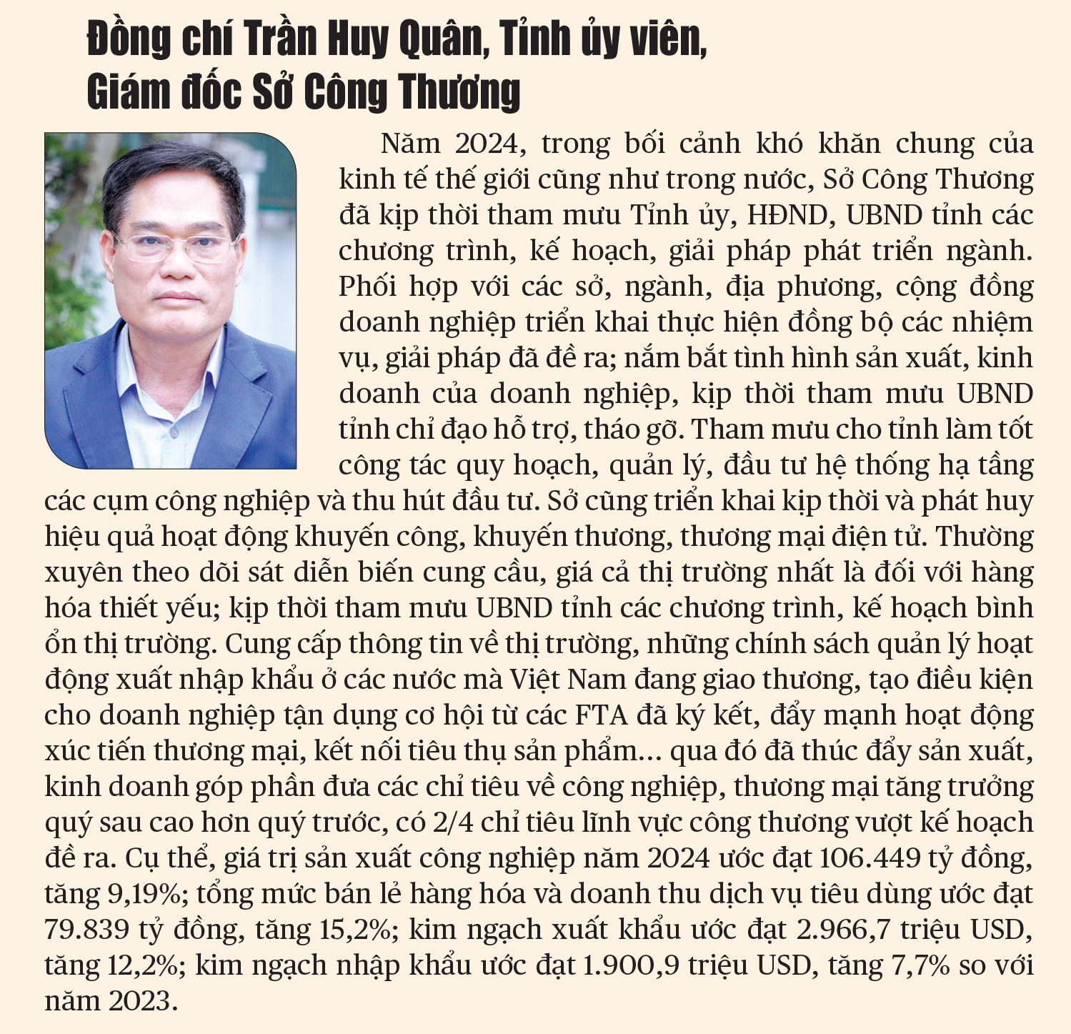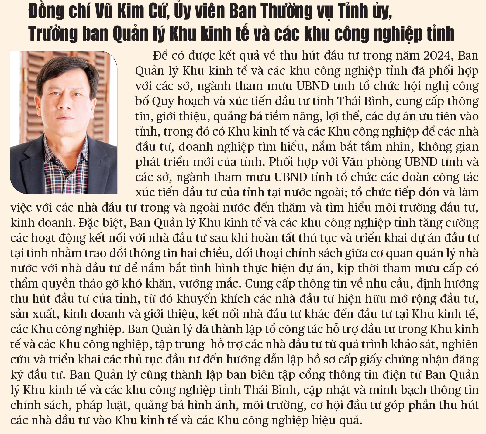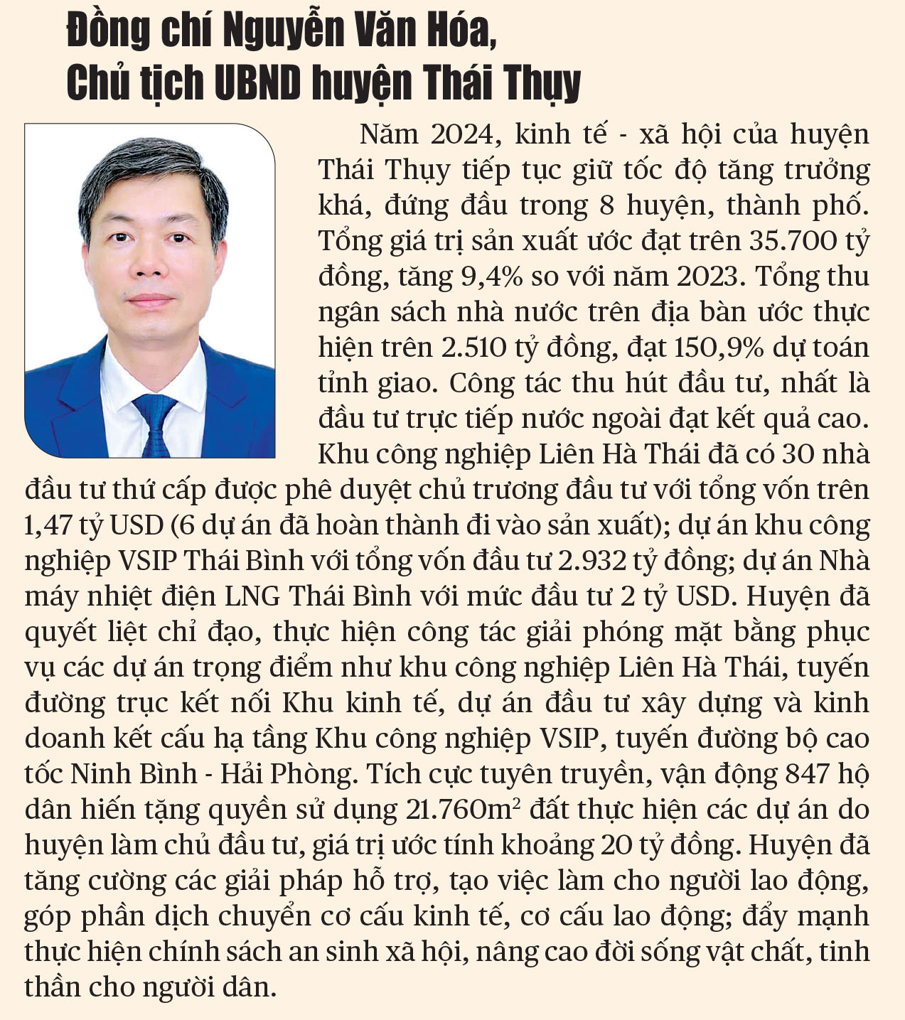 Triển khai quyết liệt các giải pháp nên kinh tế của Thái Bình có sự tăng trưởng, đồng đều ở cả ba khu vực. Tổng sản phẩm trên địa bàn tỉnh (GRDP) ước đạt 71.326 tỷ đồng, tăng 7,01% so với năm 2023, trong đó khu vực công nghiệp và xây dựng tăng 11,76%, khu vực dịch vụ tăng 6,62%; tổng giá trị sản xuất ước đạt 210.455 tỷ đồng, tăng 6,92% so với năm 2023. Sản xuất công nghiệp tiếp tục giữ vững vai trò là đầu tàu của nền kinh tế với mức tăng trưởng 9,19%, tổng giá trị sản xuất ước đạt 106.449 tỷ đồng, trong đó nhiều lĩnh vực có giá trị tăng cao như: chế biến, chế tạo ước đạt 94.136 tỷ đồng, tăng 6,7%; sản xuất truyền tải và phân phối điện đạt 11.657 tỷ đồng, tăng 35%; cung cấp nước, quản lý và xử lý rác thải, nước thải ước đạt 369 tỷ đồng, tăng 4,2% so với năm 2023... Công tác xây dựng nông thôn mới nâng cao, nông thôn mới kiểu mẫu được tập trung chỉ đạo đẩy mạnh triển khai thực hiện. Năm 2024, toàn tỉnh dự kiến công nhận 13 xã đạt nông thôn mới nâng cao, 2 xã đạt nông thôn mới kiểu mẫu, từ đó nâng tổng số xã đạt chuẩn nông thôn mới đến nay là 40 xã và 2 xã đạt nông thôn mới kiểu mẫu. Ngoài ra, tỉnh còn công nhận 18 xã hình thành sau sắp xếp đơn vị hành chính cấp xã đạt chuẩn nông thôn mới năm 2024.