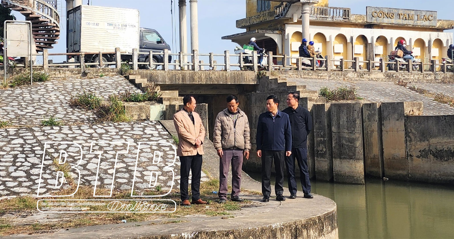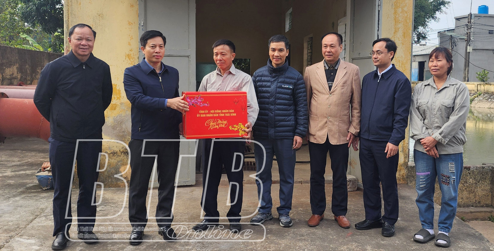 Đồng chí Lại Văn Hoàn, Tỉnh ủy viên, Phó Chủ tịch UBND tỉnh tặng quà, chúc tết cán bộ, nhân viên cống Tam Lạc, thành phố Thái Bình.