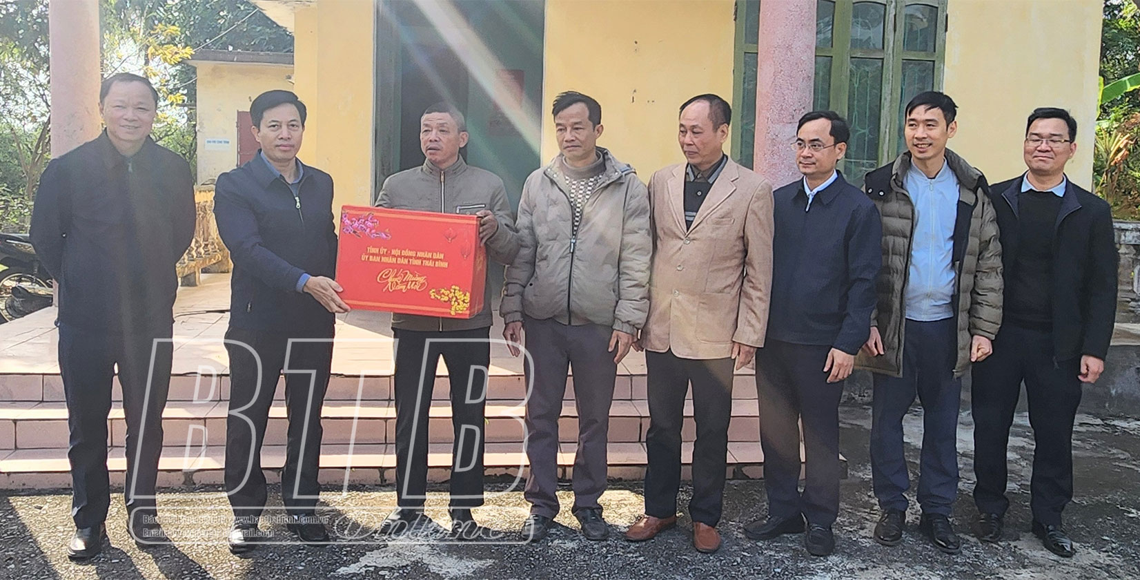 Đồng chí Lại Văn Hoàn, Tỉnh ủy viên, Phó Chủ tịch UBND tỉnh tặng quà, chúc tết cán bộ, nhân viên Trạm bơm Sa Lung, thành phố Thái Bình.