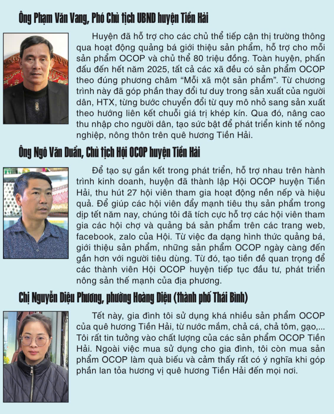 Có thể thấy các sản phẩm OCOP của huyện Tiền Hải có chất lượng tốt với nhãn mác, bao bì đẹp mắt. Từ các sản phẩm nông sản như gạo, trứng, thịt, rau, đến thủy hải sản như cá, tôm, tép, mực, rồi các sản phẩm chế biến như giò, chả, bún, rượu, cá kho hay các sản phẩm dược liệu như trà, tinh dầu, các sản phẩm thủ công mây tre đan, chiếu trúc..., hoàn toàn có thể đáp ứng nhu cầu sử dụng của người dân dịp tết, thay thế các sản phẩm nhập khẩu, hướng đến thực hiện hiệu quả cuộc vận động “Người Việt Nam ưu tiên dùng hàng Việt Nam”.