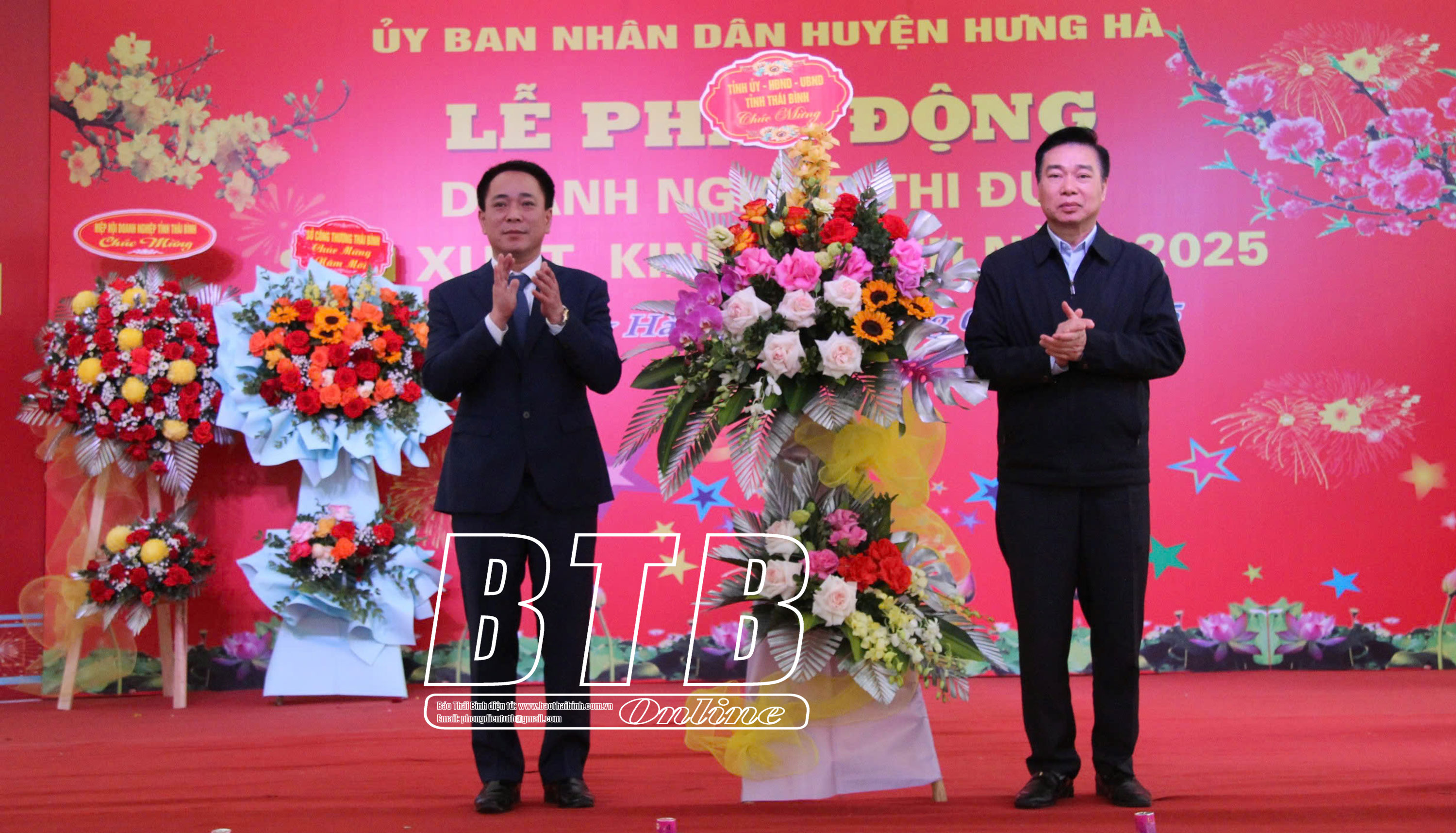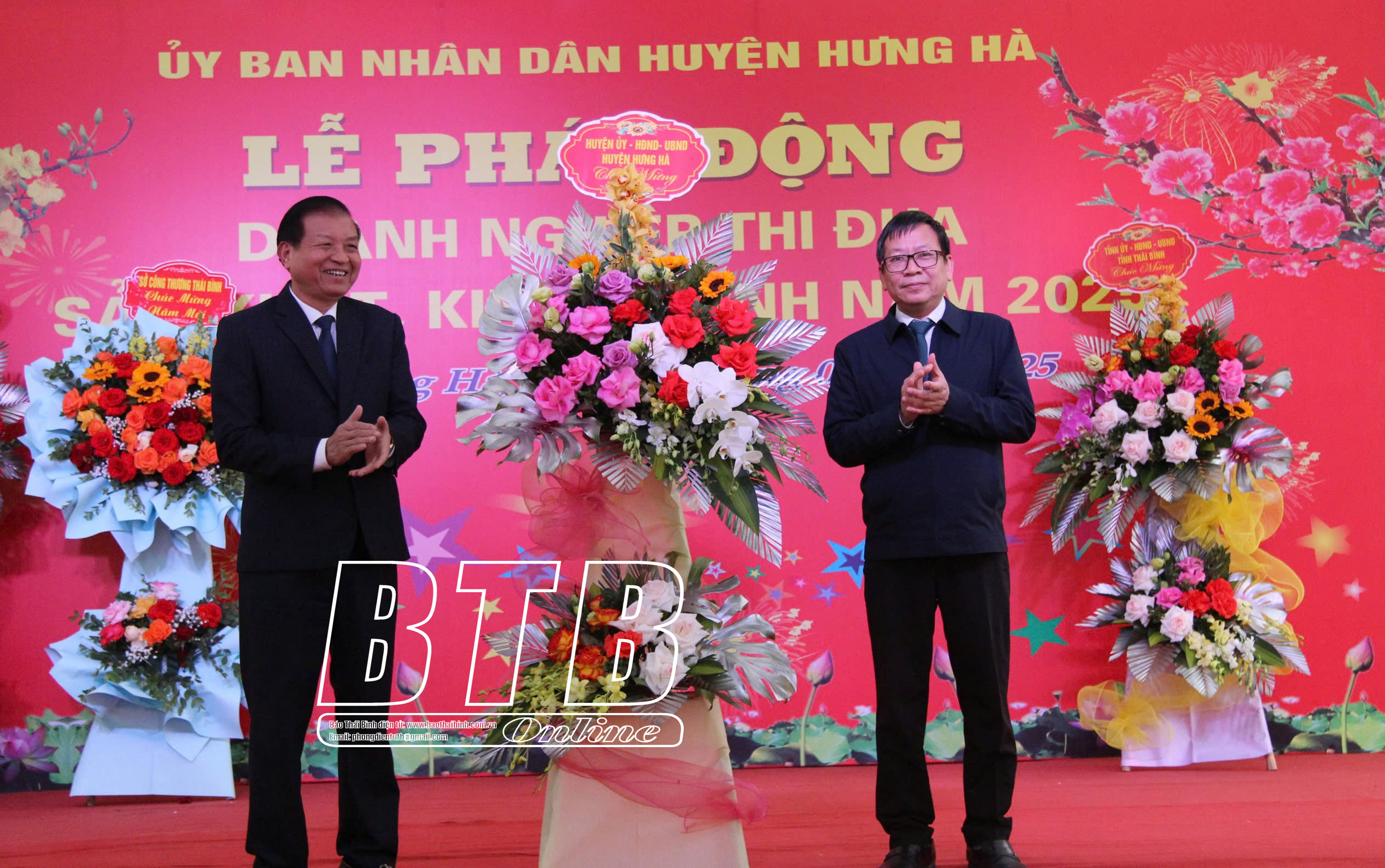 Lãnh đạo huyện Hưng Hà tặng hoa chúc mừng.
