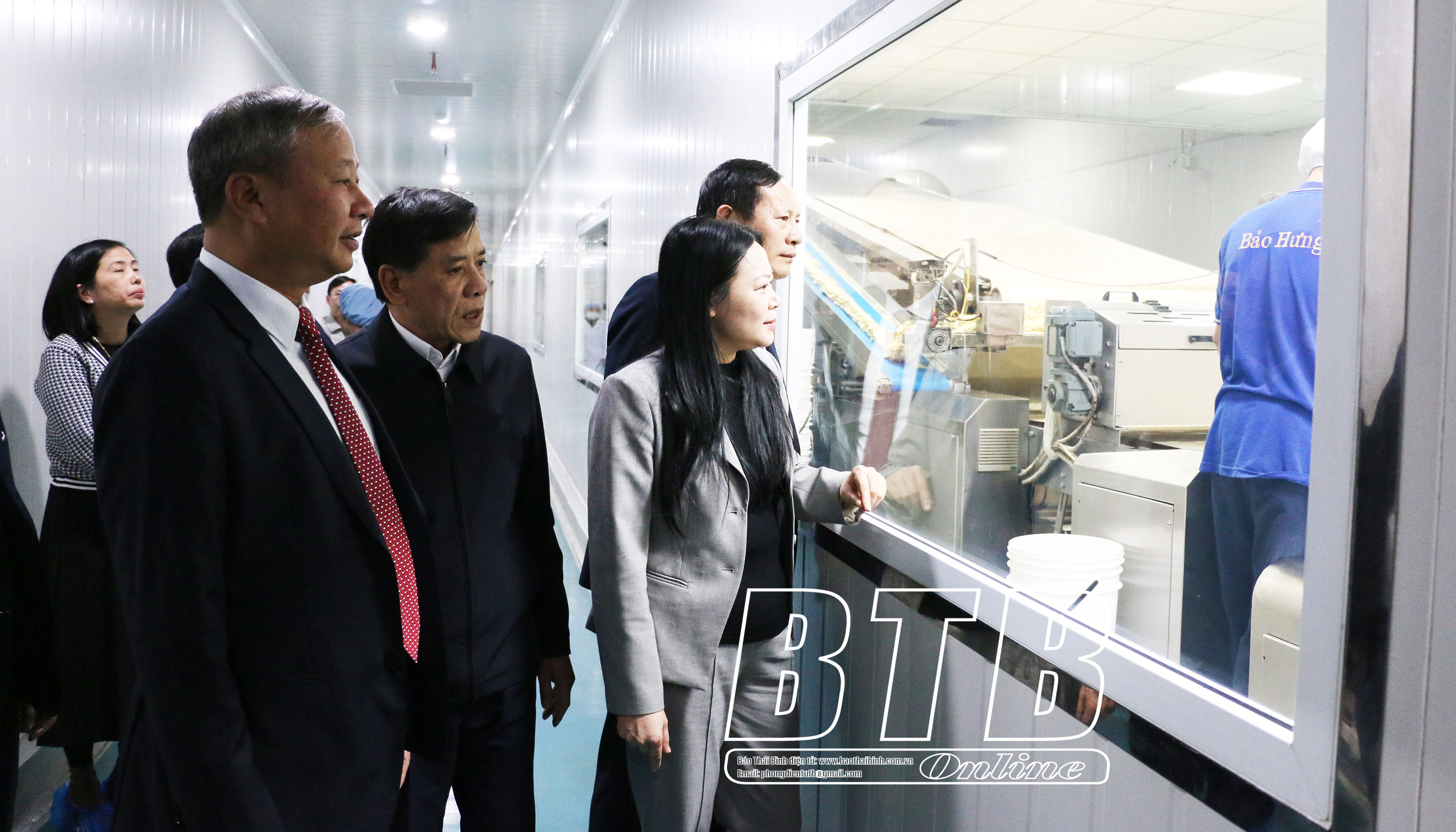 Lãnh đạo huyện Vũ Thư tham quan dây chuyền sản xuất của Công ty Cổ phần Quốc tế Bảo Hưng (cụm công nghiệp Tân Minh, xã Tự Tân).