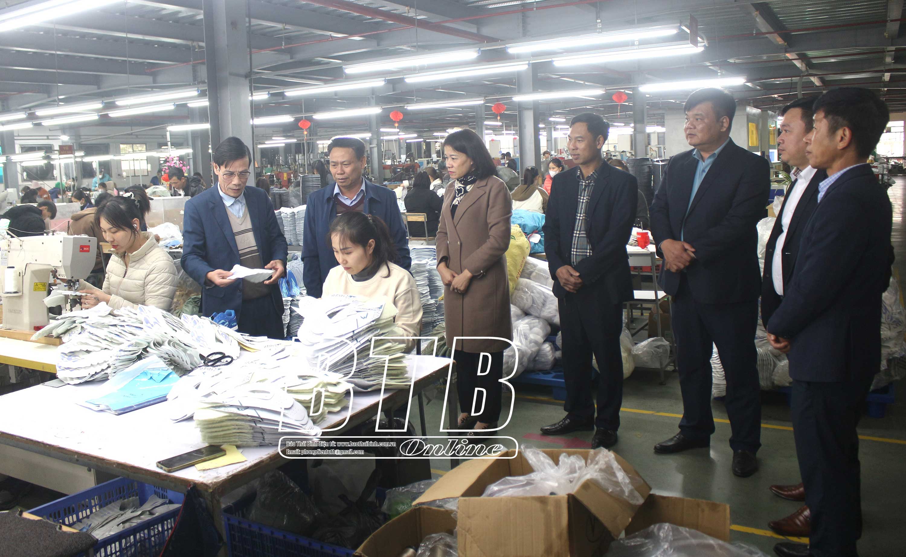 Các đồng chí lãnh đạo huyện Đông Hưng thăm, động viên Công ty Cổ phần Sản xuất và kinh doanh Sông Diêm (cụm công nghiệp Đông Phong).