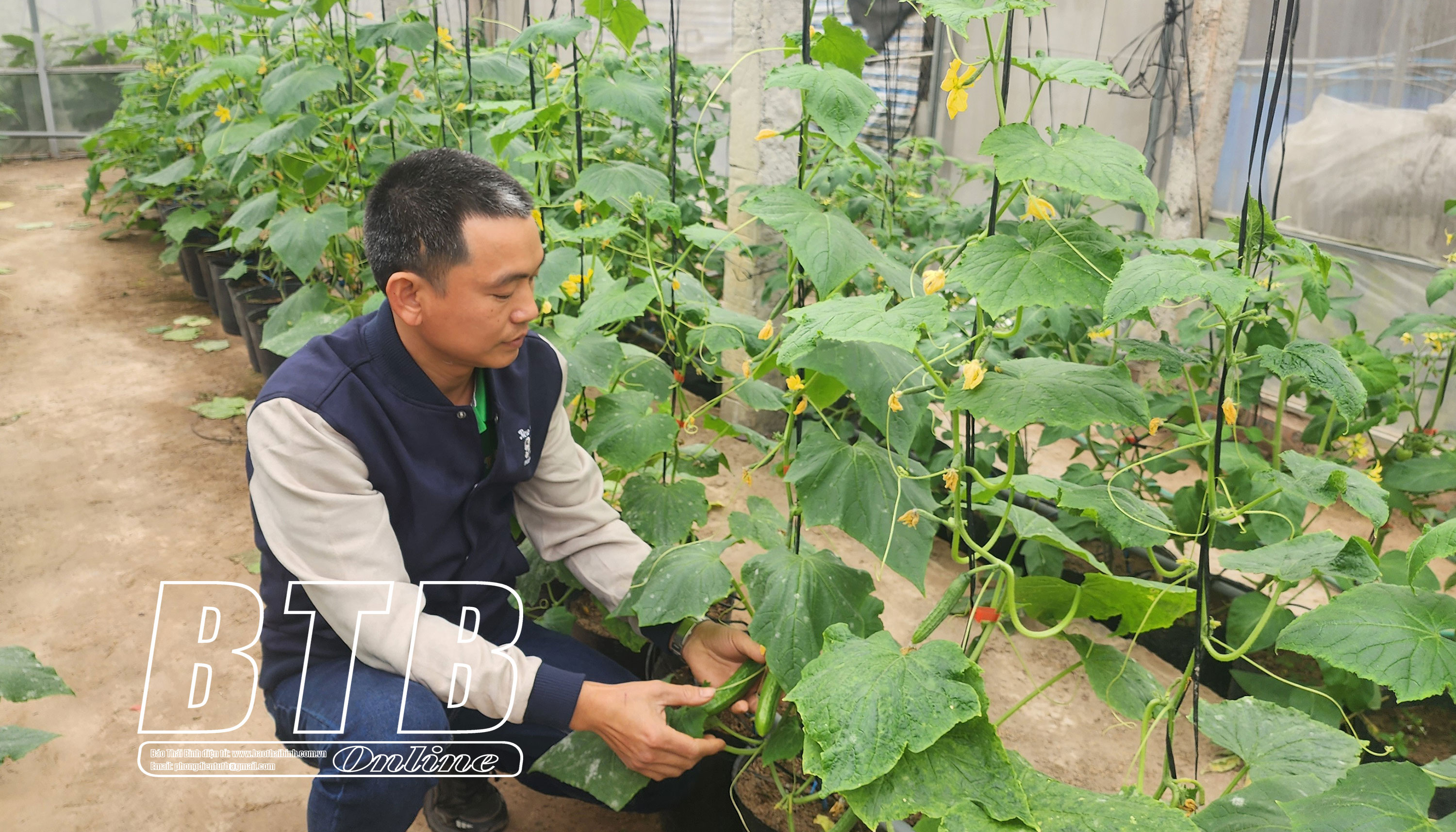 Nông dân huyện Hưng Hà thu hoạch dưa chuột trong nhà lưới.