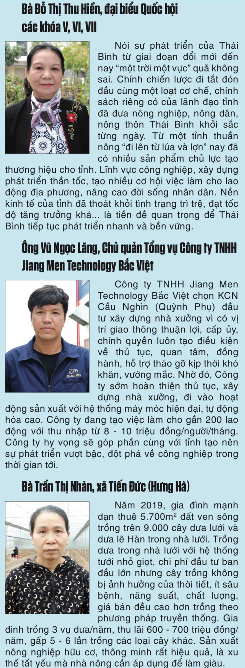Từ khi thực hiện đường lối đổi mới do Đảng khởi xướng, sản xuất nông nghiệp của Thái Bình từ chỗ dựa vào sức người là chính, hiệu quả thấp thì nay đã cơ giới hóa 100% khâu làm đất, 30% khâu gieo cấy, 80% khâu thu hoạch, 100% khâu xay xát lúa. Từ chỗ sản xuất phân tán, nhỏ lẻ, tự cung tự cấp thì nay đã hình thành và phát triển nhiều vùng sản xuất hàng hóa tập trung quy mô lớn, nông nghiệp công nghệ cao gắn với công nghiệp chế biến theo hình thức liên kết chuỗi giá trị bền vững, giúp nâng cao giá trị sản phẩm, xây dựng thương hiệu cho nông sản tỉnh. Đến nay, diện tích liên kết sản xuất toàn tỉnh trên 10.000ha, 270 HTX liên kết tiêu thụ sản phẩm với 20 doanh nghiệp, gần 1.600 trang trại chăn nuôi, 20% trang trại có thu nhập từ 2 tỷ đồng/năm trở lên.