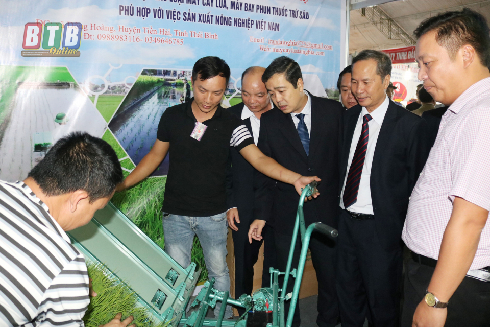 Đồng chí Ngô Đông Hải, Ủy viên dự khuyết Trung ương Đảng, Phó Bí thư thường trực Tỉnh ủy và các đồng chí lãnh đạo tỉnh tham quan gian hàng trưng bày máy nông nghiệp.