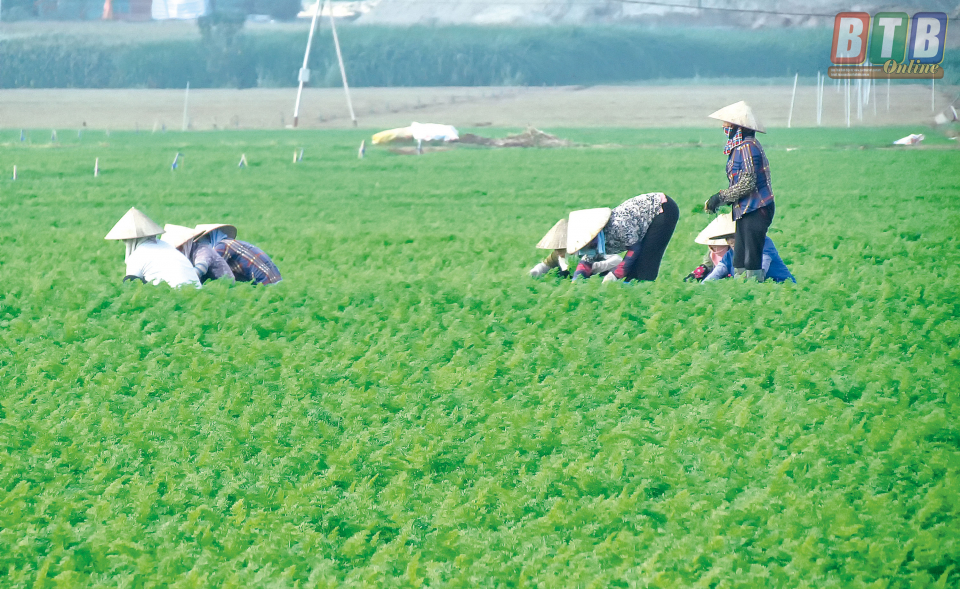 Rời vườn cam, bạn có thể đến “vựa rau” của Hưng Hà tại xã Điệp Nông. Những luống rau thẳng tít tắp, xanh mơn mởn níu chân người. Được biết, đến nay, vùng chuyên rau màu của HTX SXKD DVNN xã Điệp Nông có diện tích trên 35ha. Kể từ năm 2016, HTX là đơn vị hỗ trợ và bao tiêu sản phẩm cho nông dân. Những sản phẩm chủ lực như dưa gang, lạc, rau VietGAP... Nhờ tích cực chuyển đổi cây trồng, từng bước chuyên canh các loại rau màu theo hướng an toàn, chất lượng, nông dân Điệp Nông đã nâng cao được giá trị sản xuất trên cùng đơn vị diện tích canh tác. Hiện nay, nhiều hộ dân địa phương đang áp dụng mô hình sản xuất cây rau giống với tổng diện tích 10ha, lượng rau giống chủ yếu cung cấp ra thị trường. Ước tính mỗi năm một hộ thu lãi hàng trăm triệu đồng. Ngoài sản xuất rau, những năm gần đây Điệp Nông còn mở hướng liên kết sản xuất, trong đó tiêu biểu là sản xuất cà rốt, lúa, ngô... Tuy nhiên, ngoài vụ sản xuất chính trồng cà rốt hay lúa, ngô thì người dân Điệp Nông vẫn gắn bó với những ruộng rau xanh tươi vừa mang lại hiệu quả kinh tế vừa tô điểm cho bức tranh làng quê nông thôn mới ngày càng tươi đẹp.