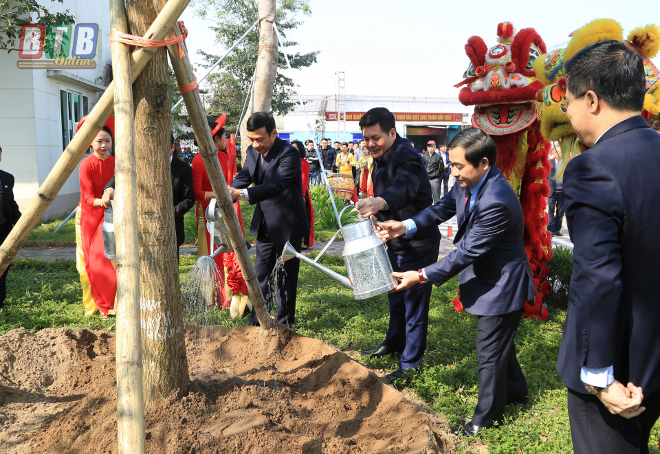 Các đồng chí lãnh đạo tỉnh tham gia trồng cây tại khuôn viên nhà máy sau lễ phát động doanh nghiệp thi đua sản xuất kinh doanh.