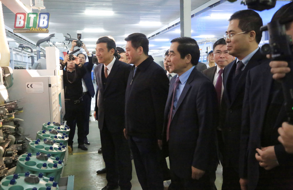 Các đồng chí lãnh đạo tỉnh tham quan dây chuyền nhà máy sợi EIFFEL Công ty Cổ phần DAMSAN, Khu công nghiệp Gia Lễ sau lễ phát động doanh nghiệp thi đua sản xuất kinh doanh.