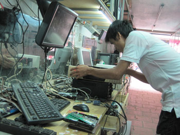 Tôi thắc mắc, trên tất cả các sản phẩm, linh kiện máy tính đều có tem ghi số seri sao có thể thay được, anh H. cười bảo: "Đây là chiêu mà những thợ đẳng cấp mới làm được. Bọn anh dùng máy sấy bóc đi tem linh kiện xịn dán vào linh kiện cũ, rồi lắp ráp lại bình thường. Chỉ dân trong nghề nhìn mới biết được”.