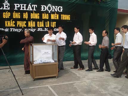 Được biết, cuộc vận động quyên góp ủng hộ đồng bào miền Trung được Thái Thụy tổ chức trong vòng 1 tháng từ ngày 20/10 đến ngày 20/11/2010. Trước lễ phát động này, huyện đã ứng trước kinh phí 100 triệu đồng gửi về Hội Chữ thập đỏ tỉnh để kịp thời giúp đỡ đồng bào miền Trung giảm bớt khó khăn, sớm ổn định cuộc sống.
