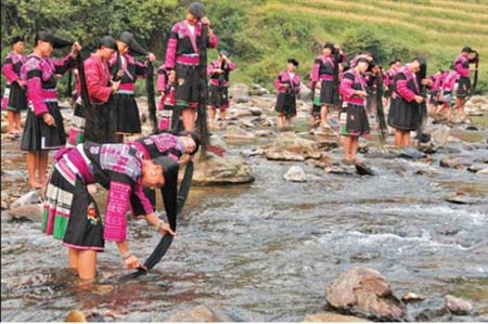 Phụ nữ Dao với mái tóc dài gội đầu bên bờ suối.