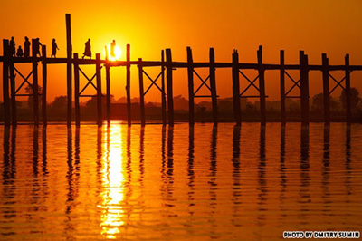 Cầu U Bein ở Myanmar, cây cầu gỗ dài nhất thế giới, là một trong những nơi lý tưởng nhất để ngắm cảnh hoàng hôn. Cầu U Bein dài 1,2 km, nối liền hai bờ của sông Taungthamna. Chiếc cầu trở thành địa điểm quen thuộc của người dân địa phương và các tín đồ Đạo Phật để ngắm nhìn cảnh mặt trời lặn cuối ngày.