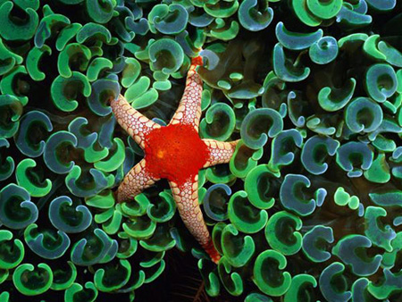 Một con sao biển nằm giữa những xúc tu hình chữ C của san hô, tại vùng biển phía Tây Thái Bình Dương.