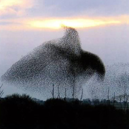Khi cùng bay lượn trên bầu trời, đàn chim với số lượng hàng nghìn con có thể vô tình tạo thành hình vòi rồng, dấu chấm than hay mặt cười.
