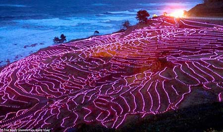 Cánh đồng lúa Shiroyone Senmaida rực rỡ nhờ được thắp sáng bởi 20.000 đèn led màu hồng.