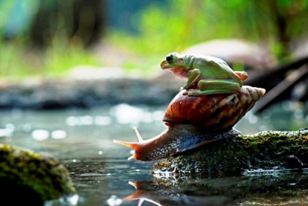 Sau khi nhìn thấy chú ếch nhảy phắt lên lưng con ốc sên đang di chuyển một cách nhọc nhằn quanh hồ nước, nhiếp ảnh gia Nordin Seruyan đã nhanh chóng đưa máy ảnh lên để ghi lại cảnh tượng thú vị tại vườn nhà ở Borneo, Indonesia.