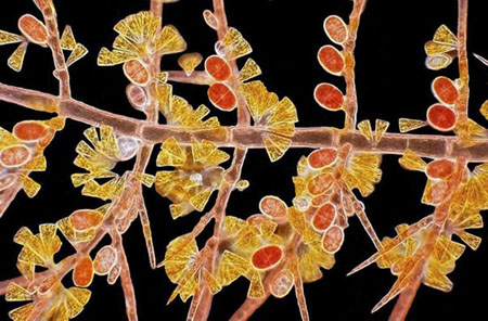Nhành tảo đỏ (màu nâu) đang “khoe” các bào tử của mình (màu đỏ), trong khi tảo cát màu vàng - một loại vi tảo khác - chụm lại cùng nhau giống như những chiếc lá màu sắc rực rỡ.