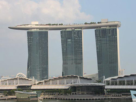Khách sạn Marina Bay Sands tại Singapore chính thức mở cửa năm 2010 với tổng vốn đầu tư 5,7 tỷ USD. Đây là khu phức hợp gồm khách sạn 2.561 phòng ngủ, bảo tàng, sòng bạc, nhà hàng, quán bar, trung tâm mua sắm và khu giải trí SkyPark trên tầng cao nhất cùng bể bơi độc đáo ở độ cao 150m.